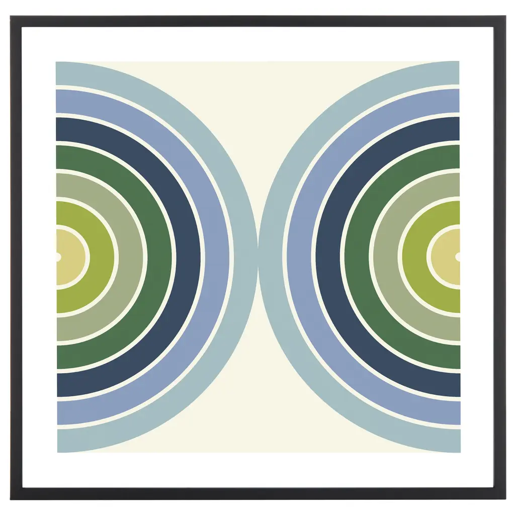 Give a chic and vibrant update to your walls with our "Put Your Records On" framed wall art. Bold geometry and bright colors are combined to bring retro glam to your home. Enriched in lively shades of blue and spring green, the wall art remains a fun way to liven up any corner of your home. It is printed on paper to brighten up your entryway, living area, or bedroom with a fresh punch of colors.