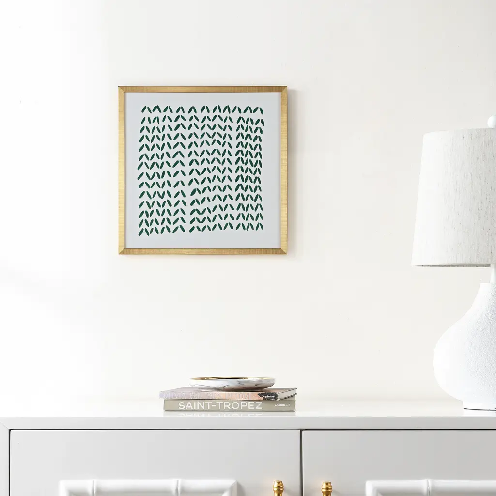 Enliven your home with the playful charm and elegance of our, "Quiet Applause" framed wall art. The artwork plays around with the spacing and alignment of each marking to bring subtle drama and elegance to your home. Chic and playful, our wall art juxtaposes a rich green shade against an ivory backdrop. It is printed on paper to make a charming statement in a modern bedroom, curated lounge, or stylish home office.