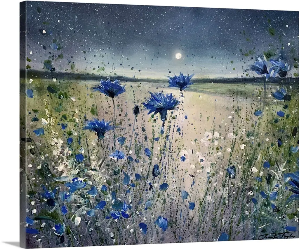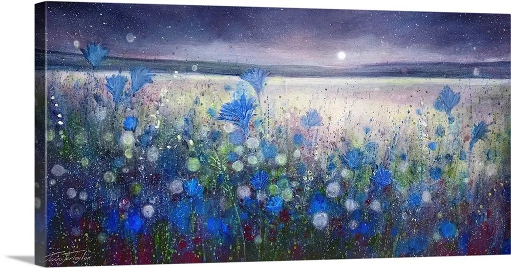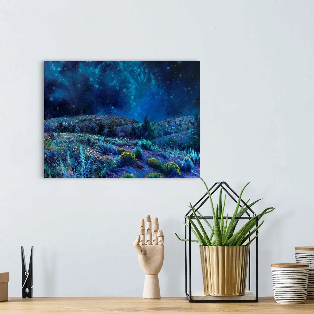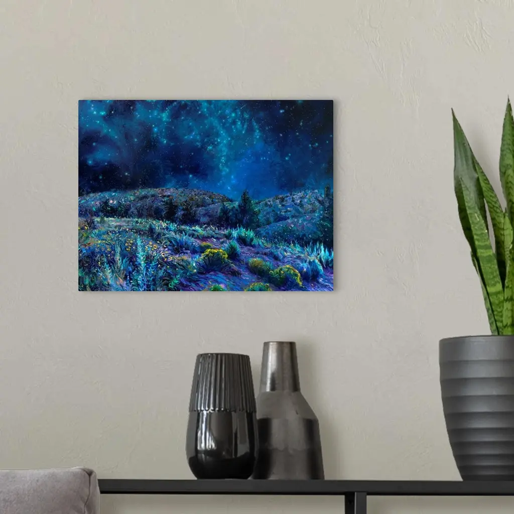 Brightly colored contemporary artwork of a cool toned landscape of the night sky and a field.