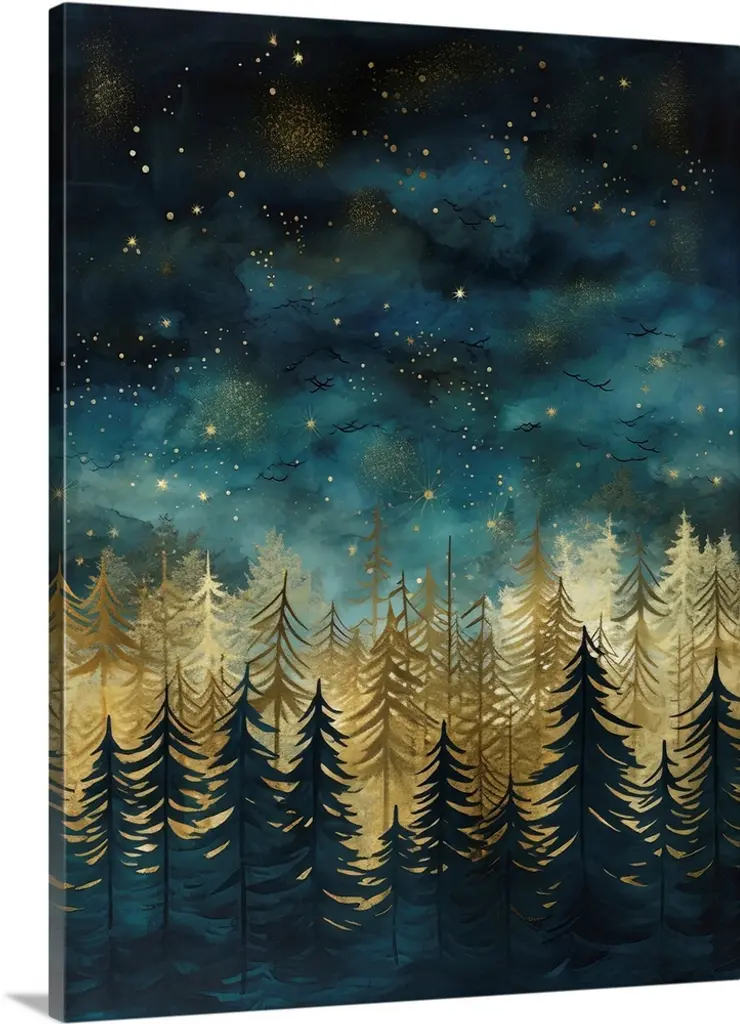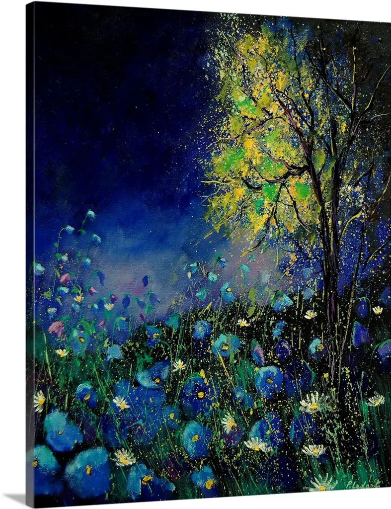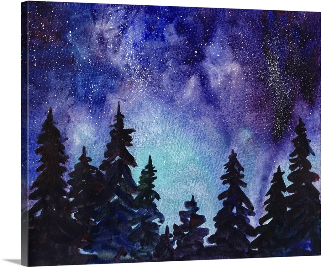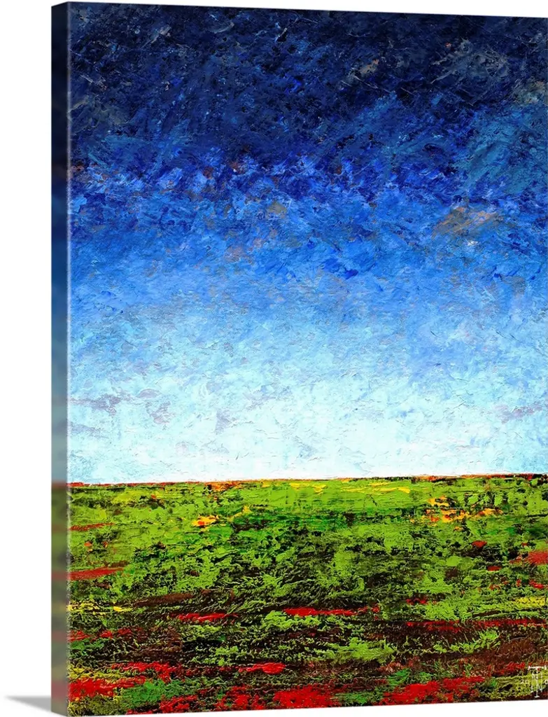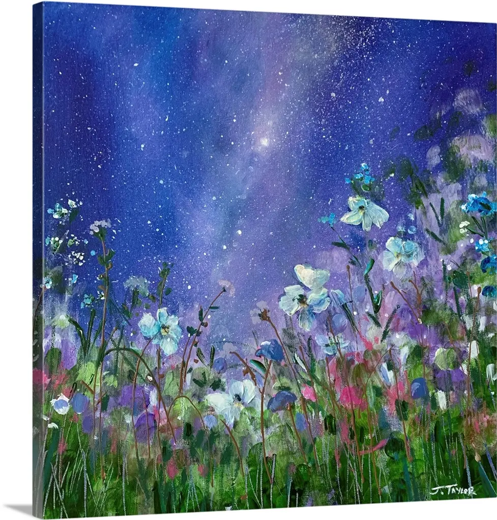 Brightly colored contemporary artwork of a cool toned landscape of the night sky and a field.