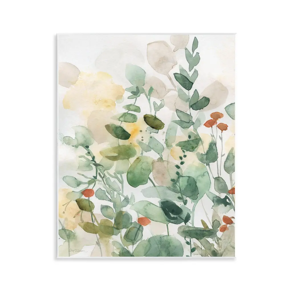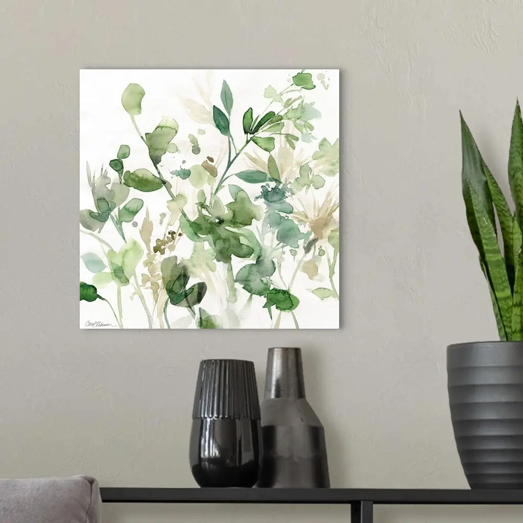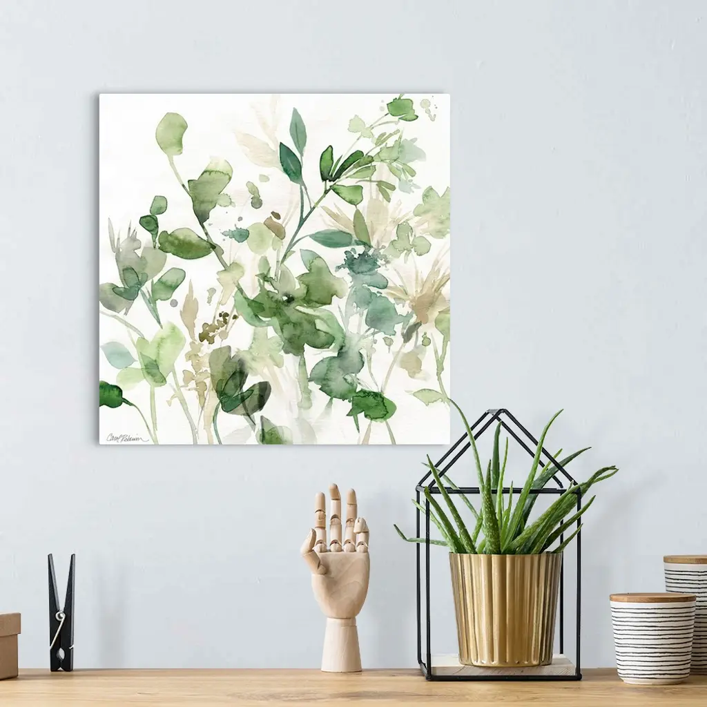 Square watercolor painting of an abstract garden with flowers and vegetation in shades of green, blue, and brown.