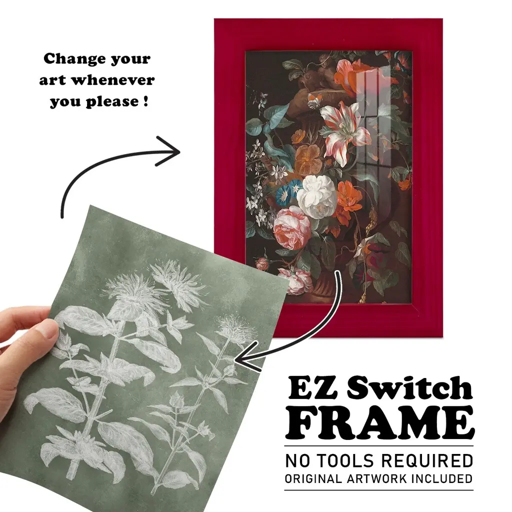 Sage Impressions III -EZ SWITCH Framed Print w/glass-Cherry Red A delightful, framed print. Featuring a solid wood frame with real wood glass. This premium print is giclee quality. In addition, every frame features a removable back and table top stand. This allows you to change your art in the future or to just stand the art on a table for a new look. We are sure you'll enjoy our new series of EZ SWITCH Framed Art. Solid Wood Frame Real Glass Removable / Replaceable Art Built in Tabletop Stand Sizes range from 4x6 up to 12x15 - buy just one or pair them up as sets as you see fit.