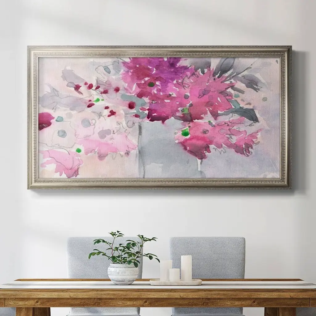 Sage Meadow by artist Kate DeOssie is a stunning, naturally inspired giclee print on canvas featuring purple and green florals. The florals are ghosted over silver leaf, infusing the piece with a sense of mystique that creates a wonderful focal point within an interior space. This artwork is held within a silver floater frame and may only be displayed in a horizontal orientation.