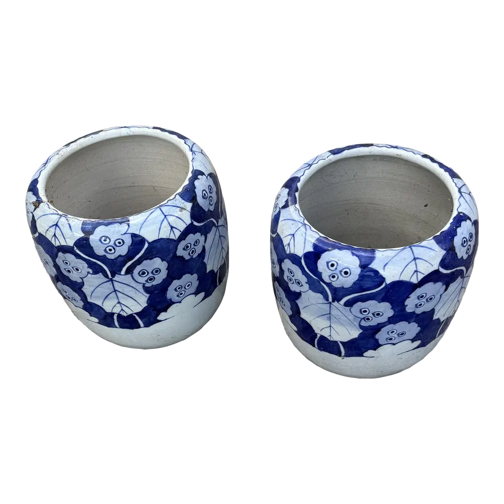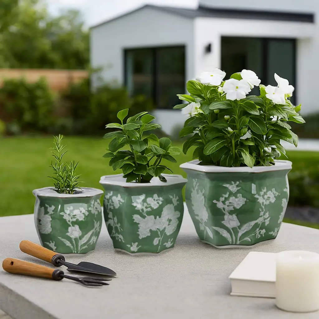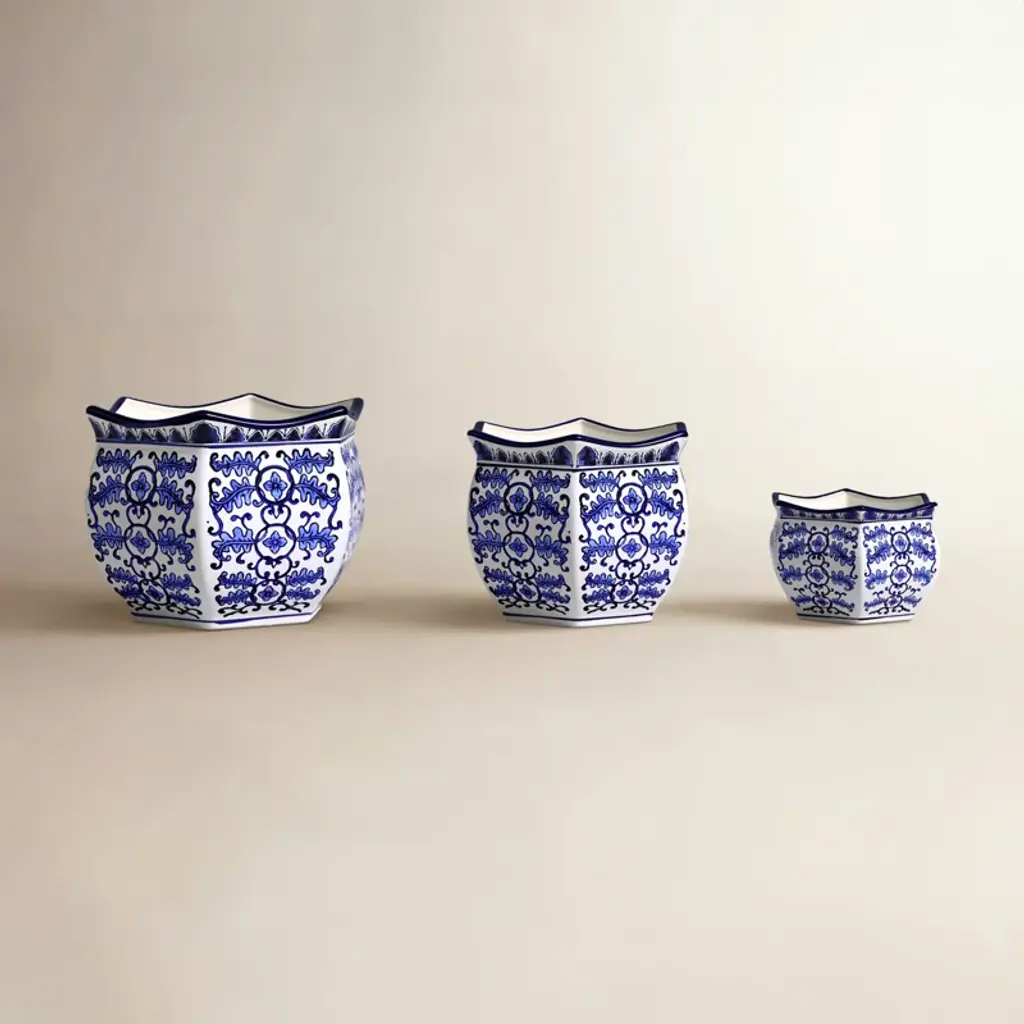 Sagebrook Home 3Pc Chinoiserie Dahlia Ceramic Planter Pots: Hexagon, Hand-painted, No Drainage Hole(s)