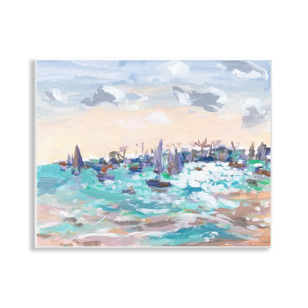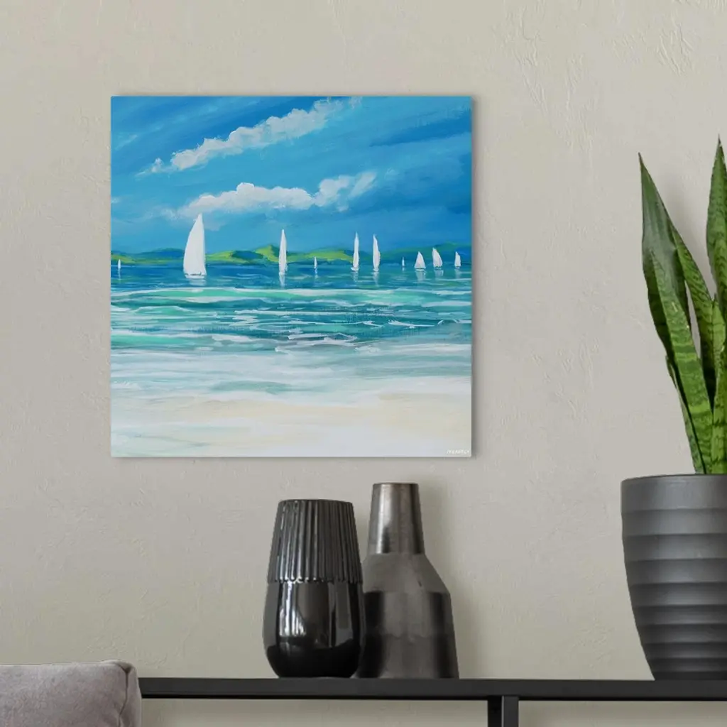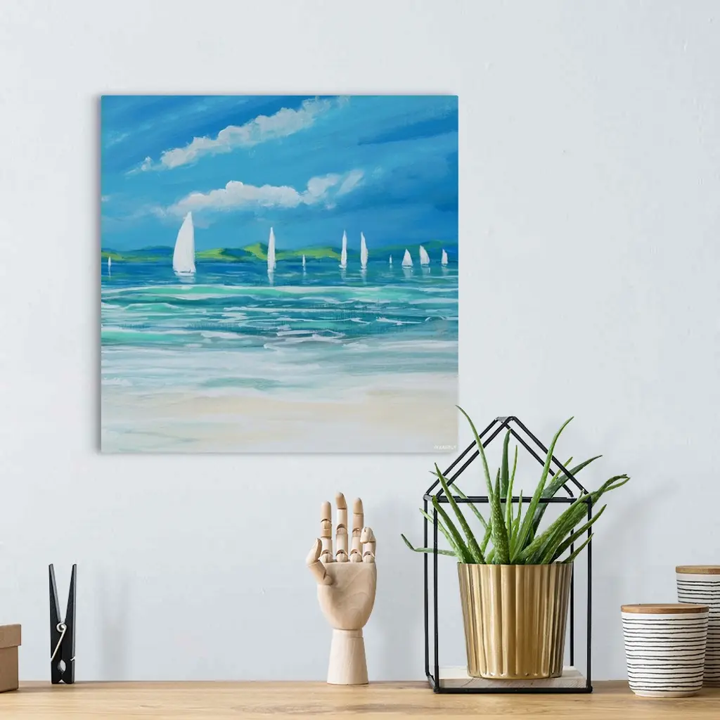 Contemporary painting of white sailboats on the ocean, seen from the shore.