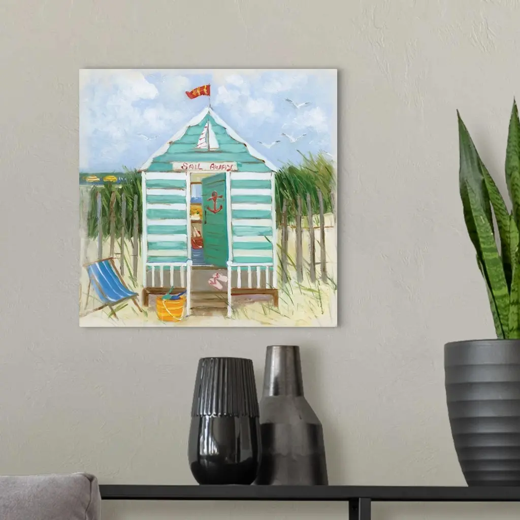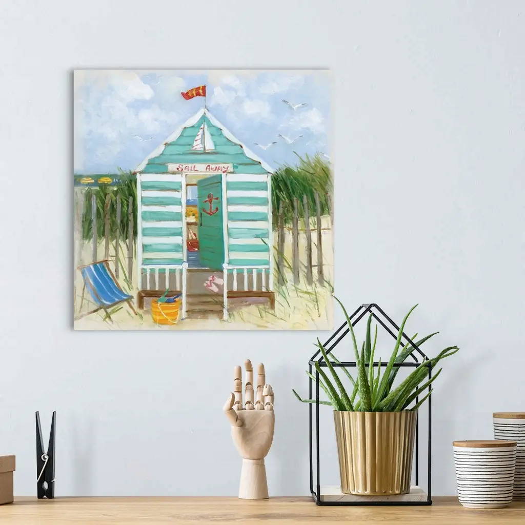 Square painting of a teal and white beach hut with the ocean in the distance.