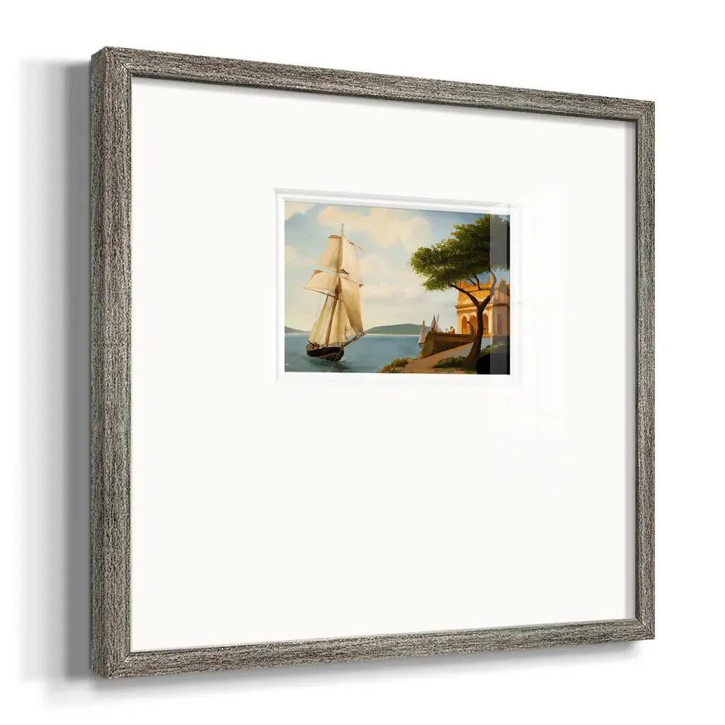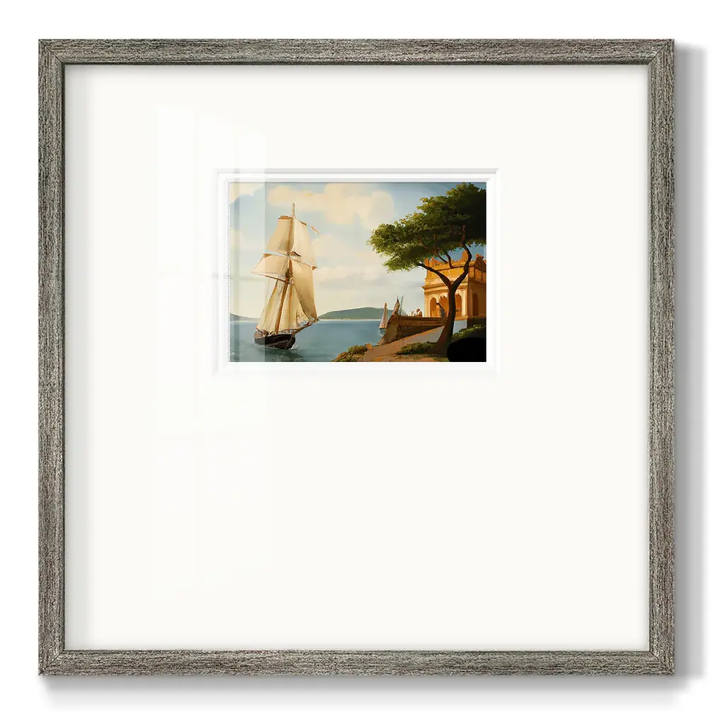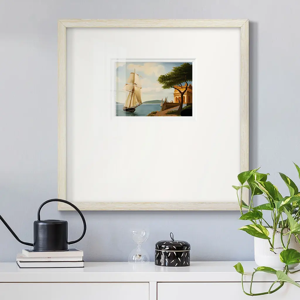 Sail Boat on the EdgePremium Framed Print A framed cold pressed paper print featuring superior double matting and quality frame. 2 SIZES AVAILABLE 16''X16''' - Overall Size 20''X20''' - Overall Size Each piece is made to order. Each piece comes with hanging hardware. Made in the USA Ready to Hang Giclee Paper Print Plexiglass Beveled Matt Board Double Matte Board