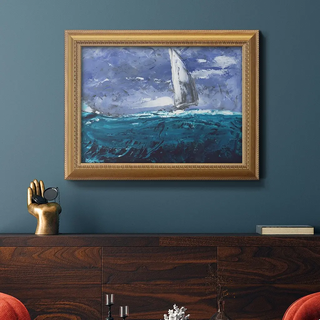 Sail Ho I Premium Framed Canvas- Ready to Hang A Premium Framed Canvas created to last. Framed in distressed wood and available in an array of sizes and colors Featuring a beveled a solid wood stretcher bar, each piece comes ready to hand 3 SIZES AVAILABLE 16''X20'' - Overall Size 18'X27'' - Overall Size 24''x36'' - Overall Size Each piece is made to order. Each piece comes with hanging hardware. Made in the USA Ready to Hang Giclee Paper Print Acrylic Glass Beveled Matt Board
