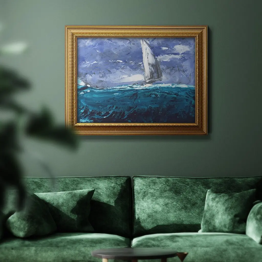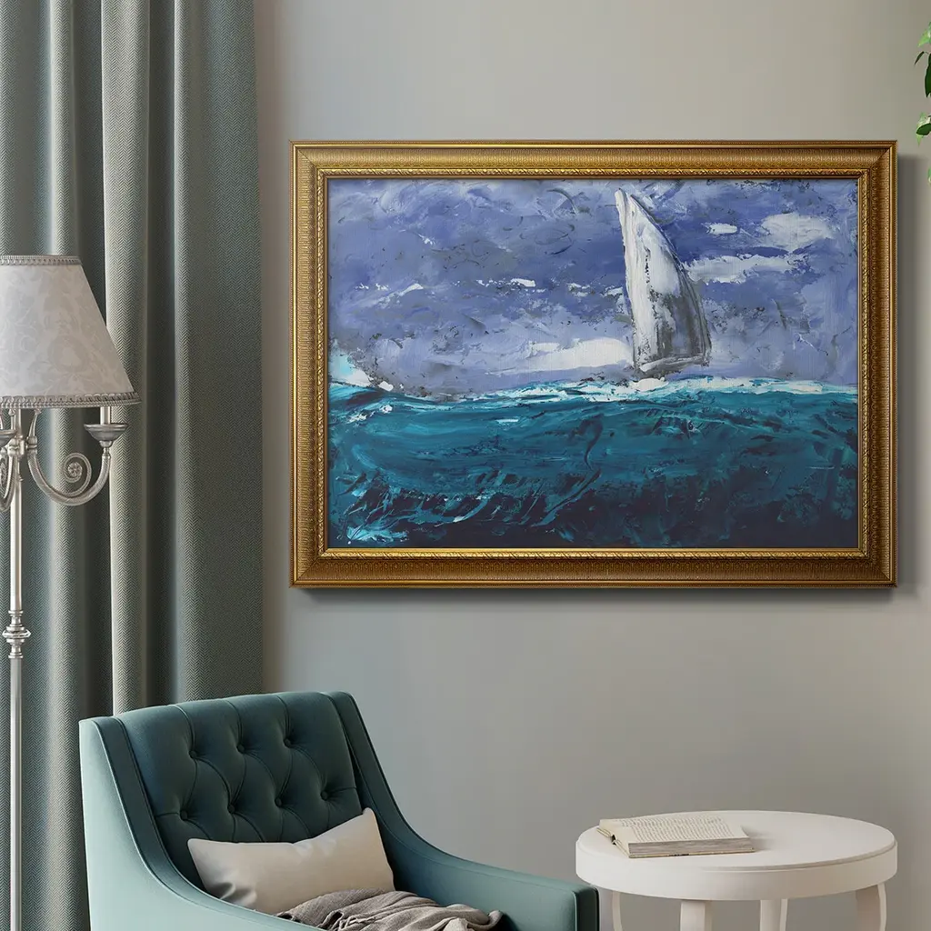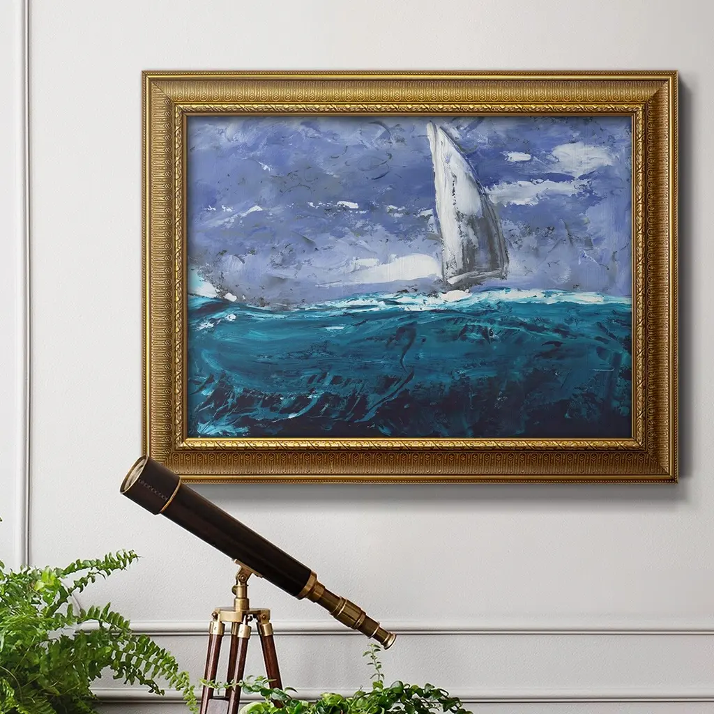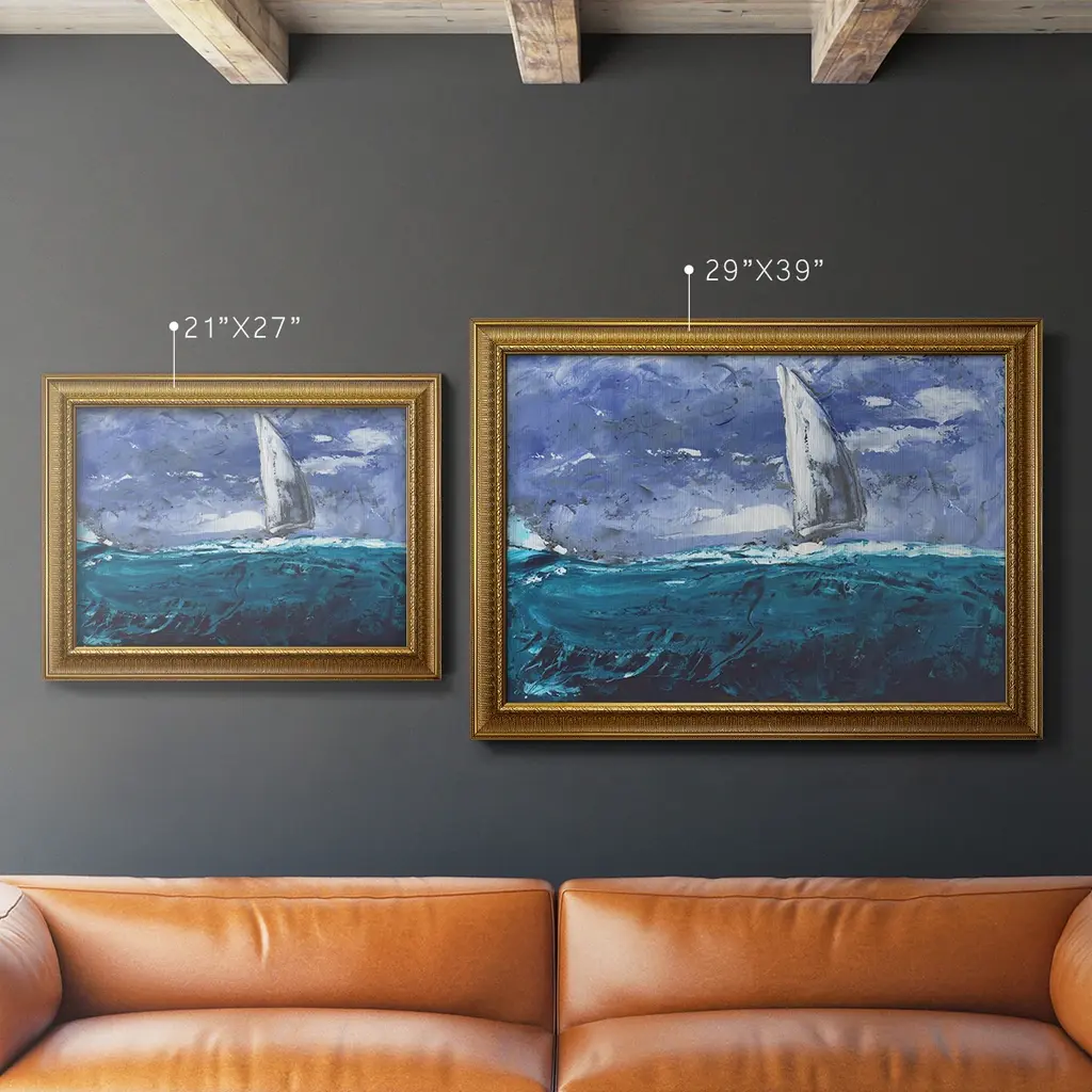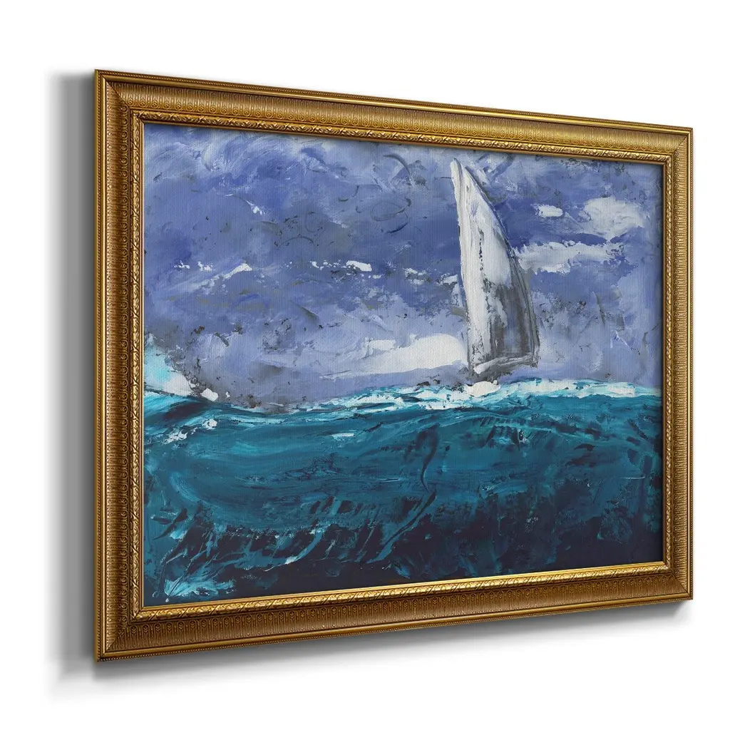 Sail Ho I Premium Framed Canvas- Ready to Hang A Premium Framed Canvas created to last. Framed in distressed wood and available in an array of sizes and colors Featuring a beveled a solid wood stretcher bar, each piece comes ready to hand 3 SIZES AVAILABLE 16''X20'' - Overall Size 18'X27'' - Overall Size 24''x36'' - Overall Size Each piece is made to order. Each piece comes with hanging hardware. Made in the USA Ready to Hang Giclee Paper Print Acrylic Glass Beveled Matt Board
