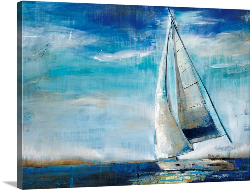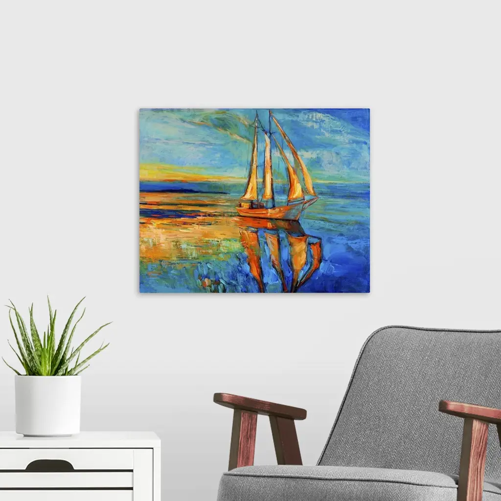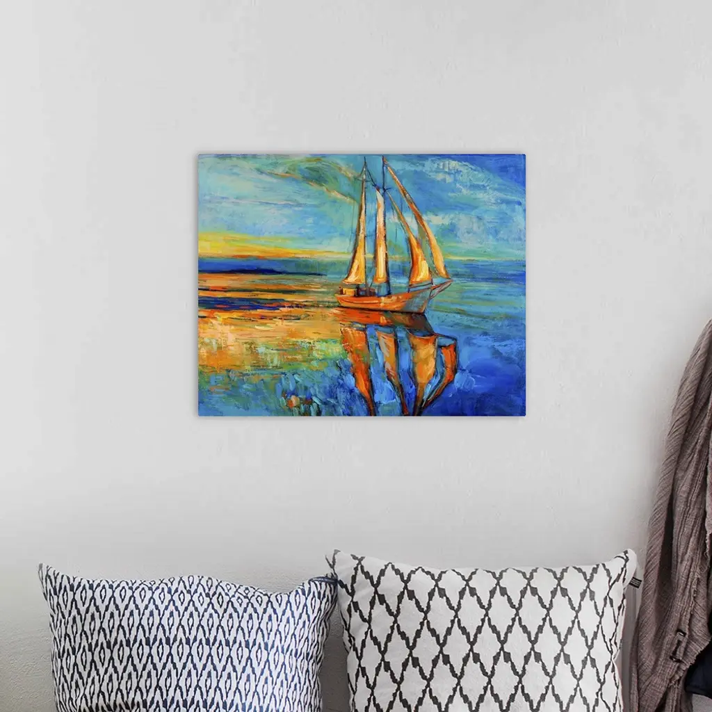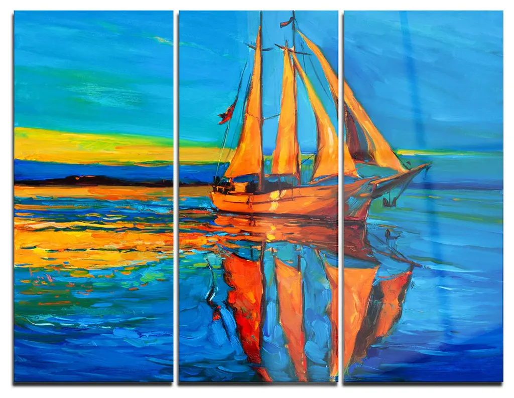 Originally an oil painting of a ship and sea on canvas. Sunset over ocean. Modern impressionism.