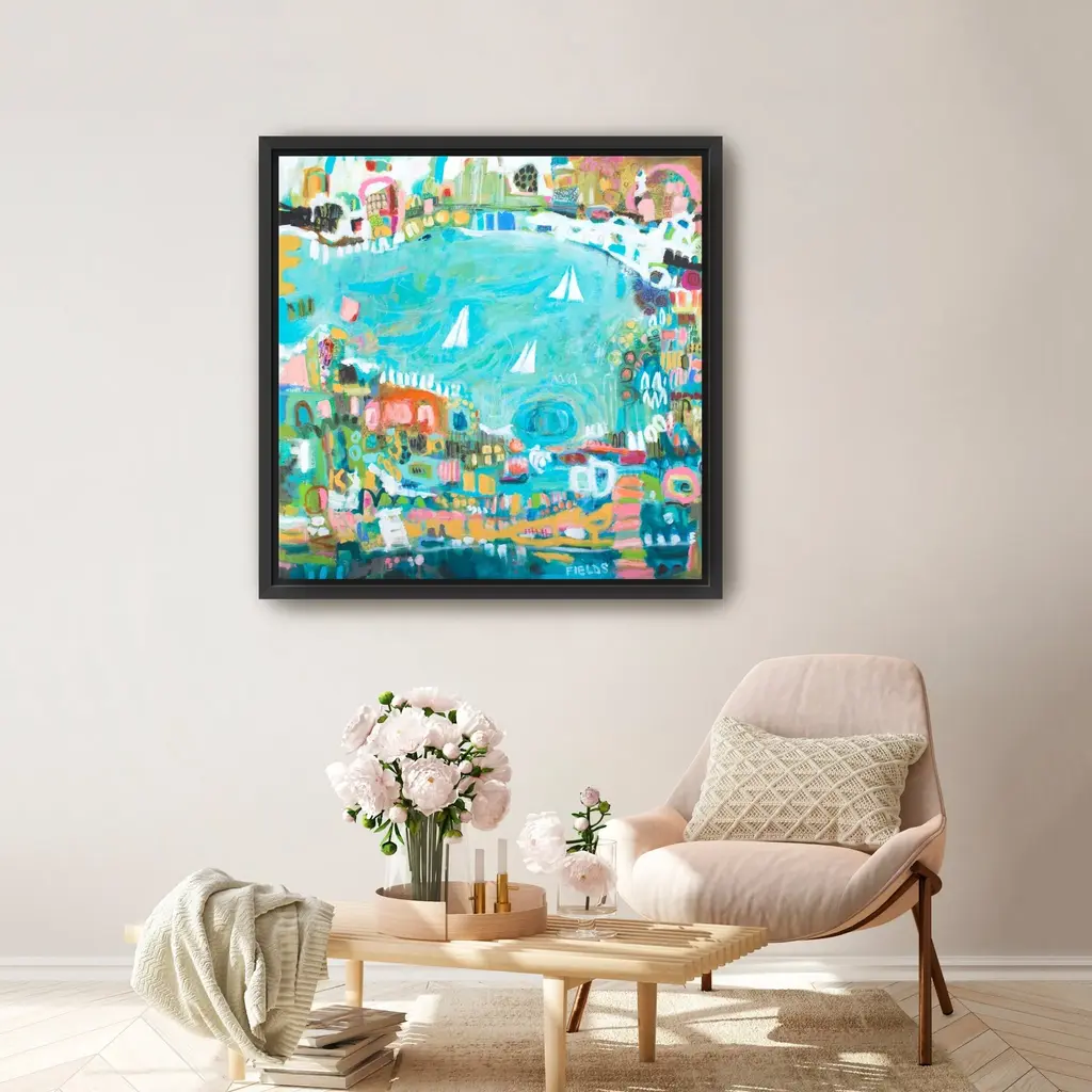 Elevate your decor with this enchanting abstract coastal canvas art print featuring graceful sailboats gliding across tranquil waters. With a harmonious blend of soft blues, gentle whites, and hints of warm hues, this artwork captures the essence of coastal life and the beauty of sailing.Available in black frame, dark walnut frame and oak frames, or as a frameless canvas. Our Gallery Wrap Canvas Prints are proudly assembled with high quality materials in California, USA. Each piece is printed on a thick, archival grade canvas using Giclee technology. It is then hand-stretched by our experienced artisans over solid pine bars, which will not warp over time. The final product is a piece personally crafted for you to confidently display on your wall. Care and Assembly: Ensure that the location of your piece has little to no exposure to heat, sunlight, and moisture. Wipe clean, only if needed. Each piece includes a sawtooth hanger to hang on your wall horizontally.