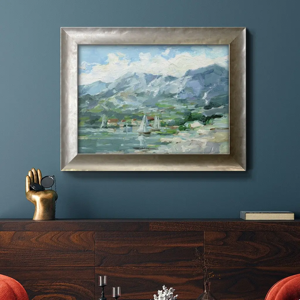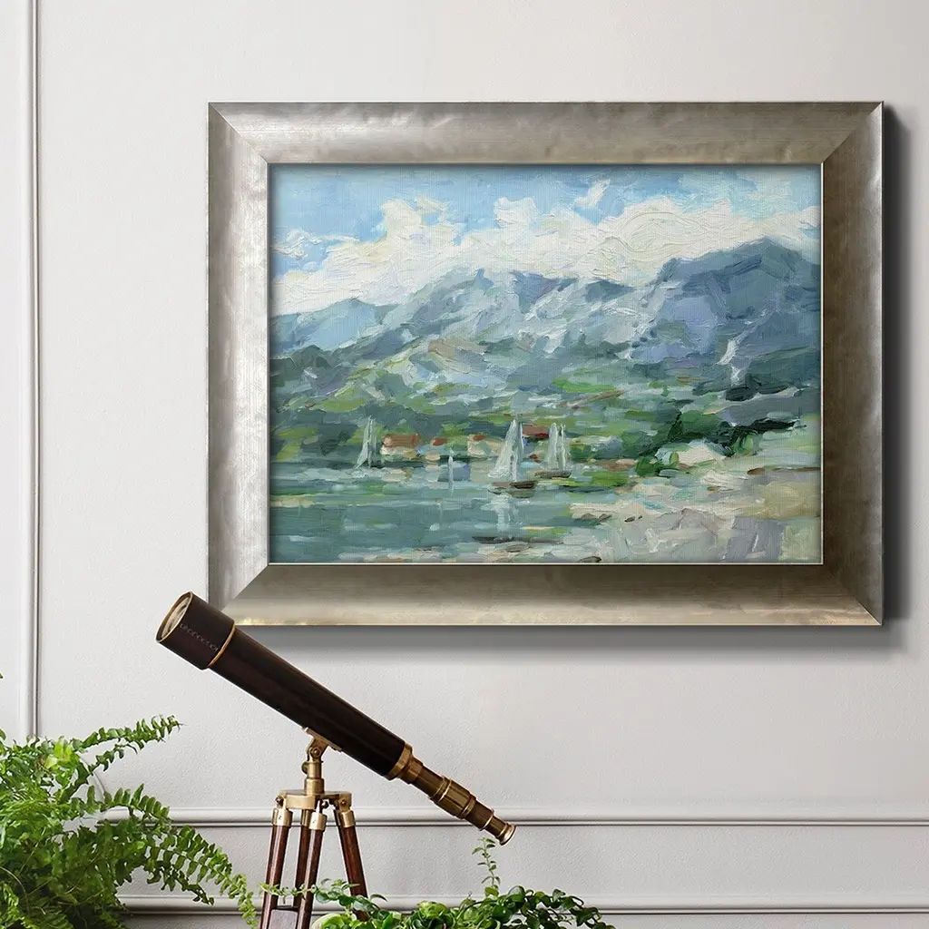 Sailing Along the Coast I Premium Framed Canvas- Ready to Hang A Premium Framed Canvas created to last. Framed in distressed wood and available in an array of sizes and colors Featuring a beveled a solid wood stretcher bar, each piece comes ready to hand 3 SIZES AVAILABLE 16''X20'' - Overall Size 18'X27'' - Overall Size 24''x36'' - Overall Size Each piece is made to order. Each piece comes with hanging hardware. Made in the USA Ready to Hang Giclee Paper Print Acrylic Glass Beveled Matt Board
