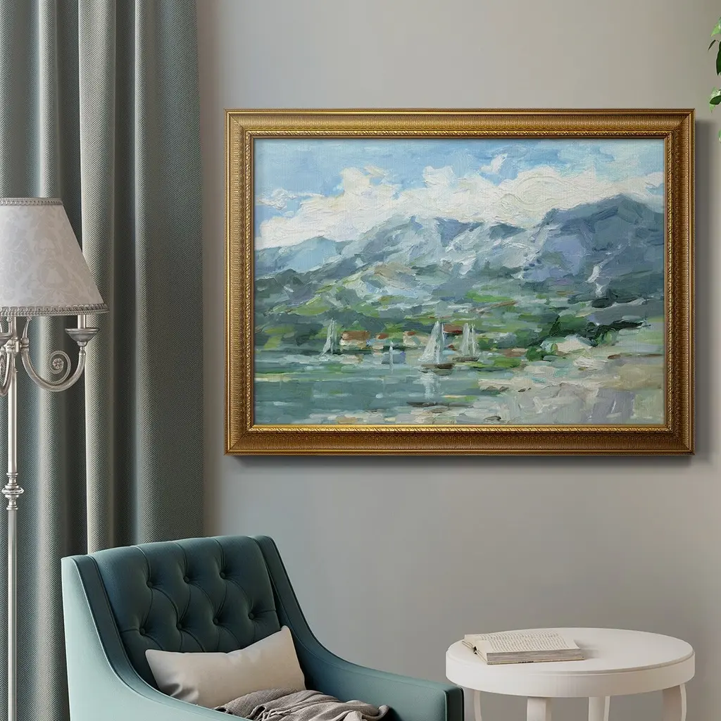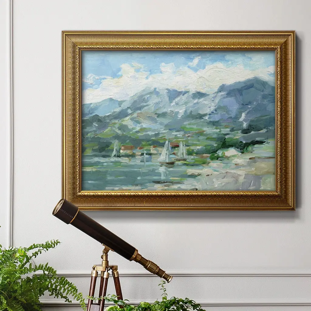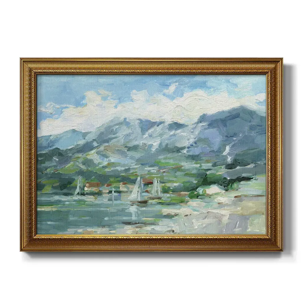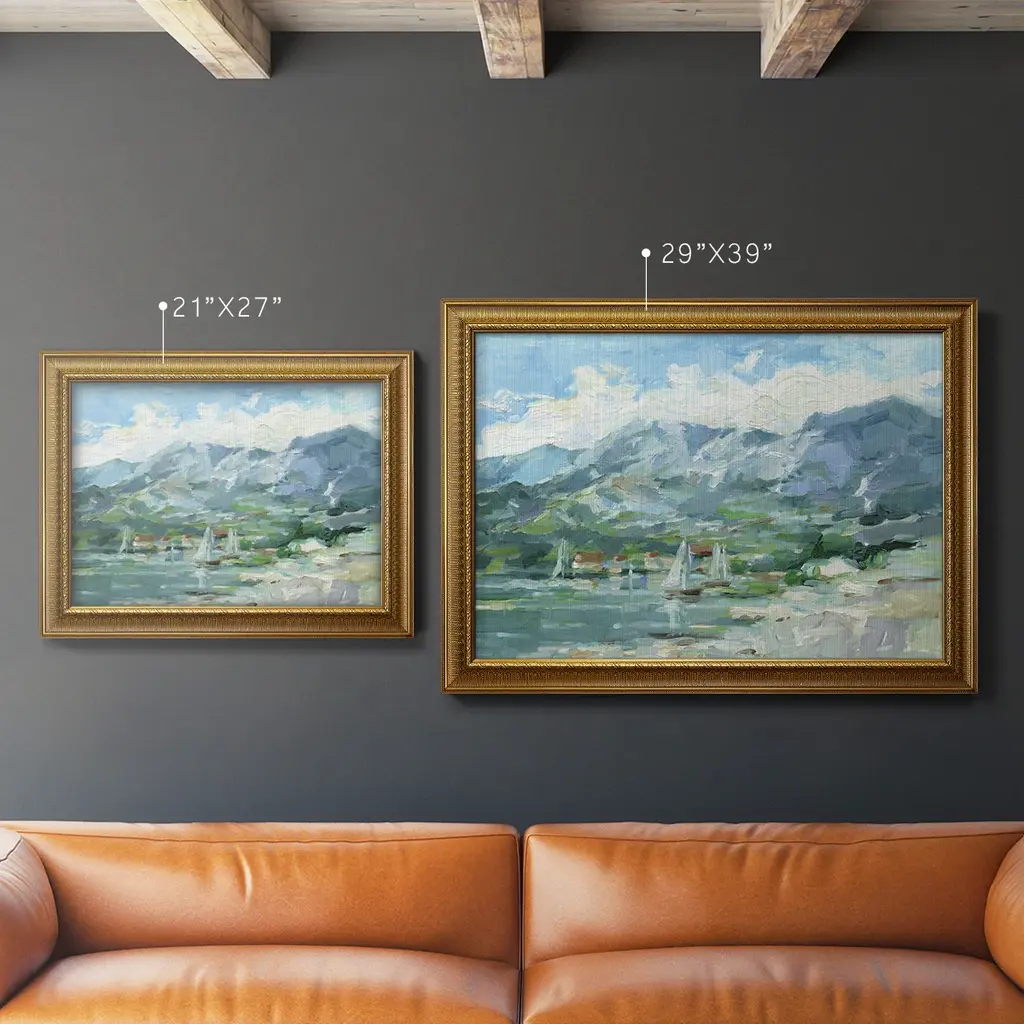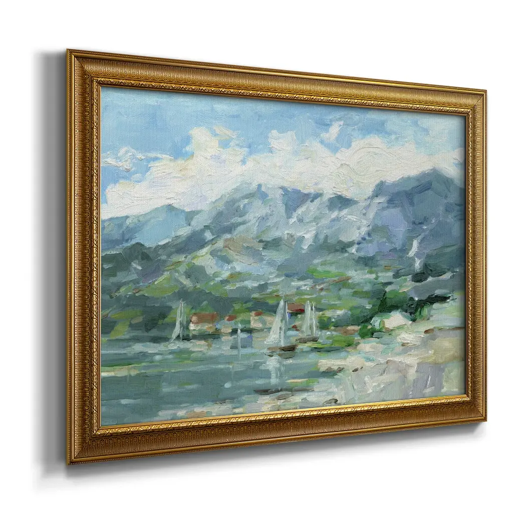 Sailing Along the Coast I Premium Framed Canvas- Ready to Hang A Premium Framed Canvas created to last. Framed in distressed wood and available in an array of sizes and colors Featuring a beveled a solid wood stretcher bar, each piece comes ready to hand 3 SIZES AVAILABLE 16''X20'' - Overall Size 18'X27'' - Overall Size 24''x36'' - Overall Size Each piece is made to order. Each piece comes with hanging hardware. Made in the USA Ready to Hang Giclee Paper Print Acrylic Glass Beveled Matt Board