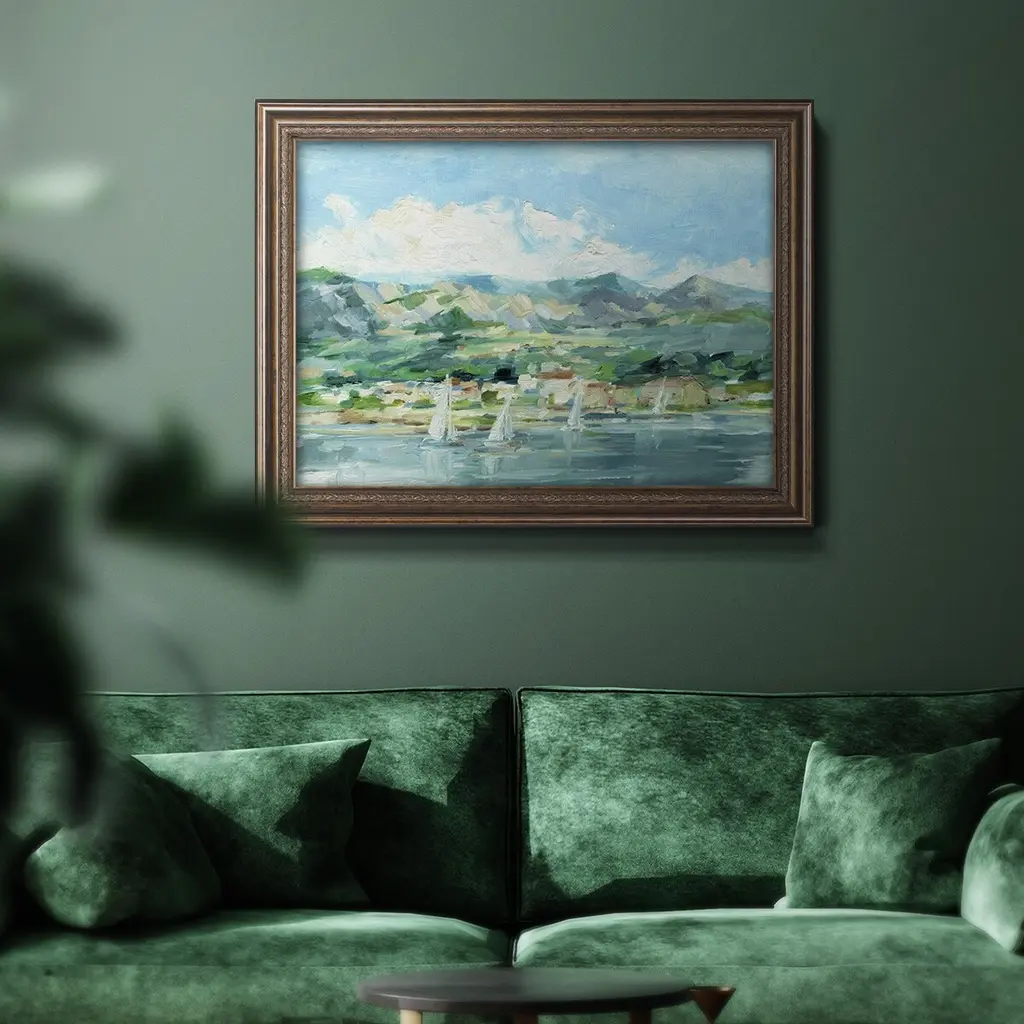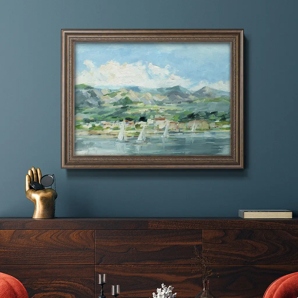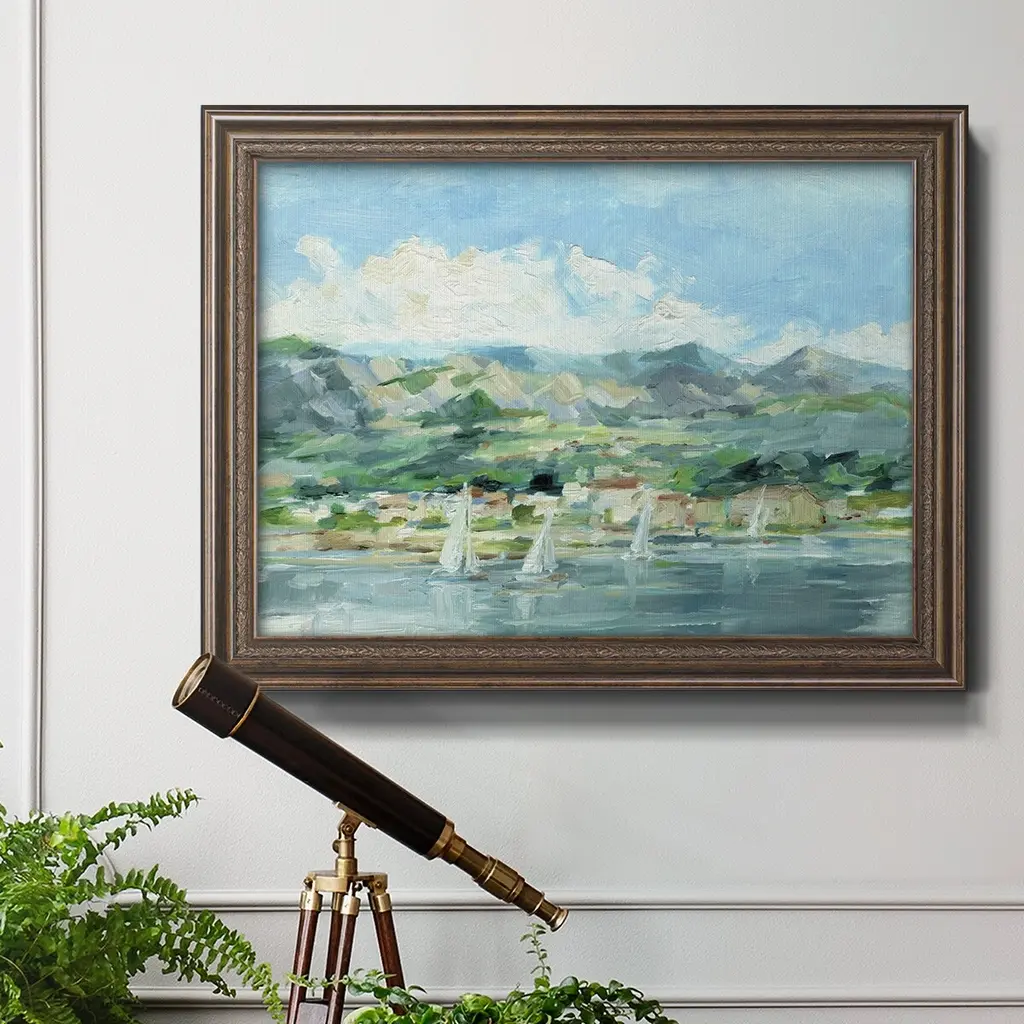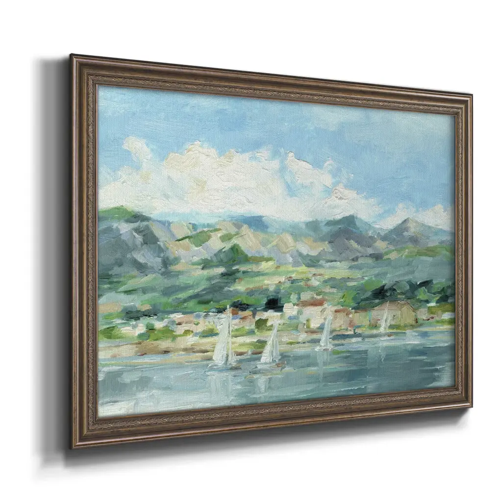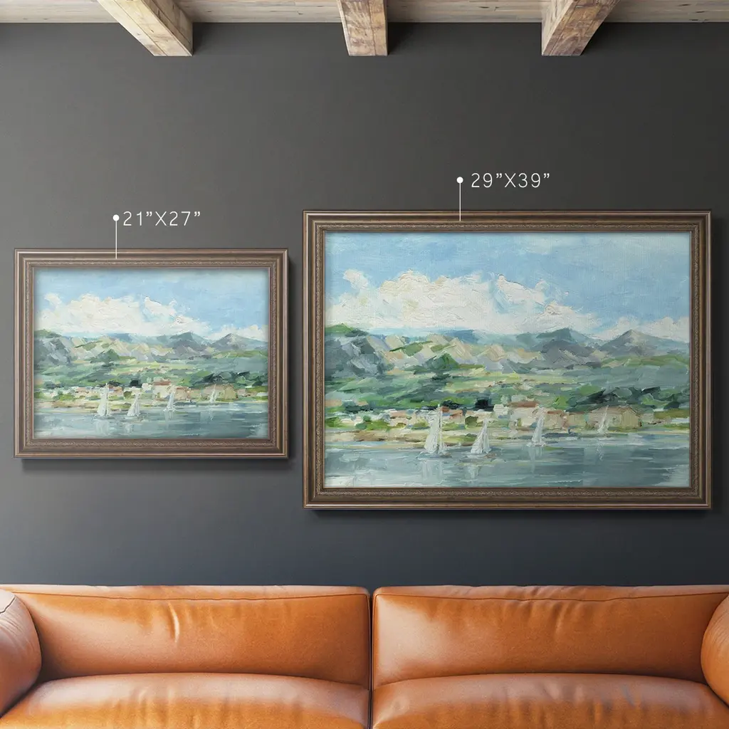 Sailing Along the Coast II Premium Framed Canvas- Ready to Hang A Premium Framed Canvas created to last. Framed in distressed wood and available in an array of sizes and colors Featuring a beveled a solid wood stretcher bar, each piece comes ready to hand 3 SIZES AVAILABLE 16''X20'' - Overall Size 18'X27'' - Overall Size 24''x36'' - Overall Size Each piece is made to order. Each piece comes with hanging hardware. Made in the USA Ready to Hang Giclee Paper Print Acrylic Glass Beveled Matt Board
