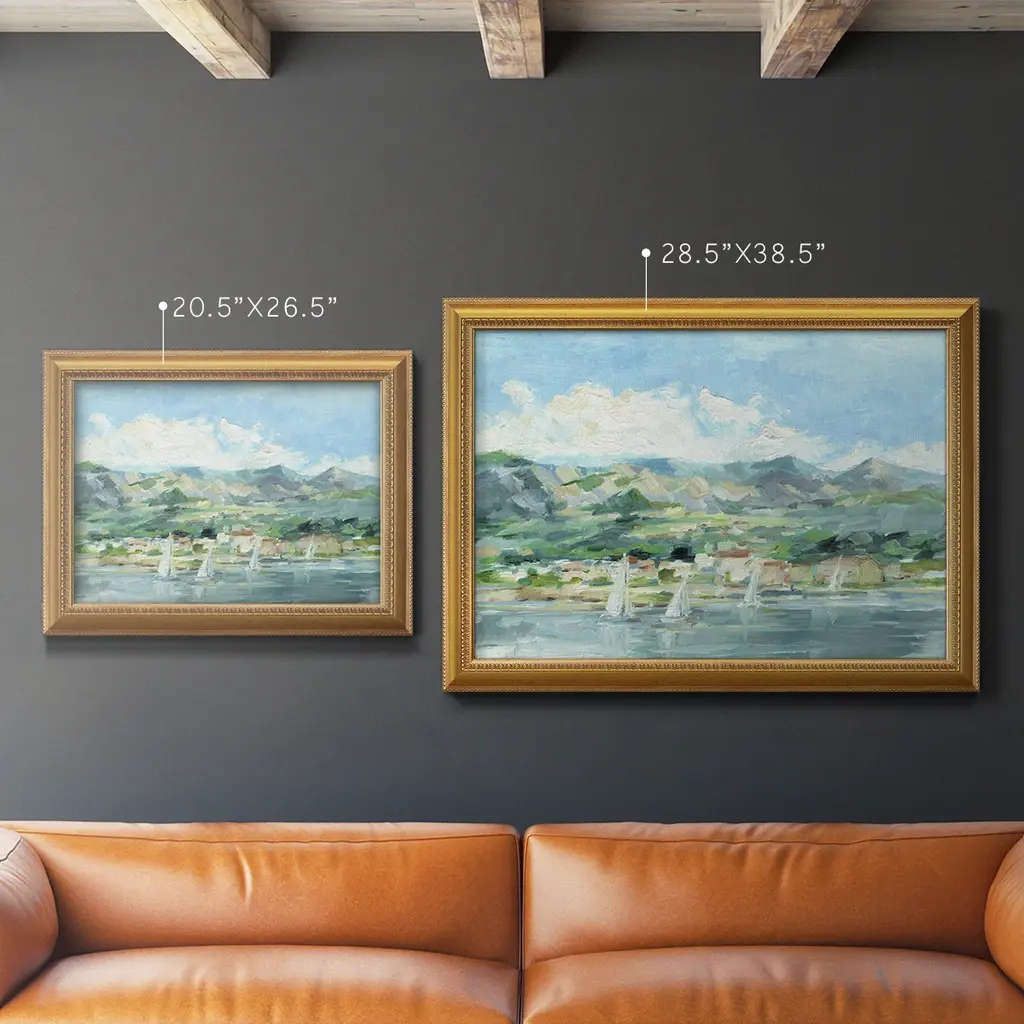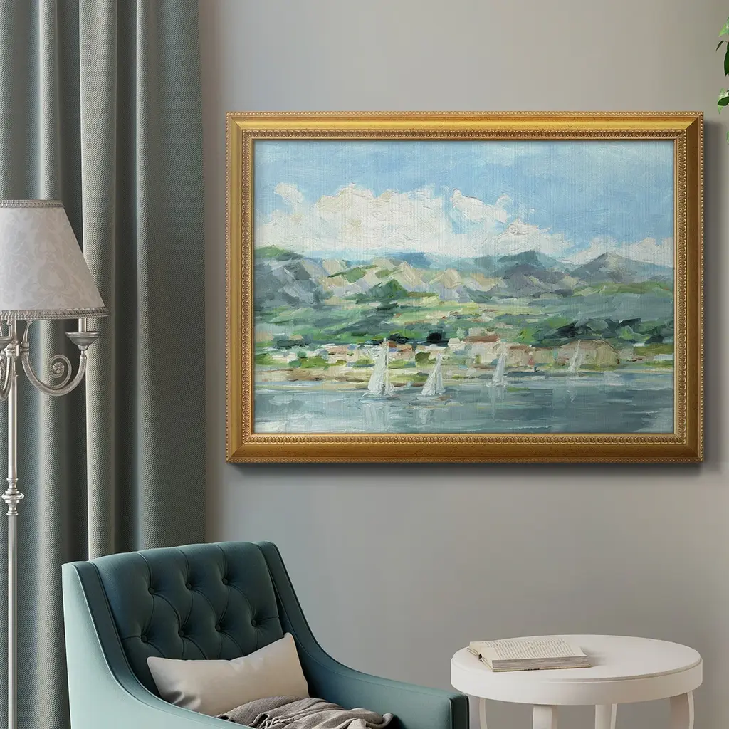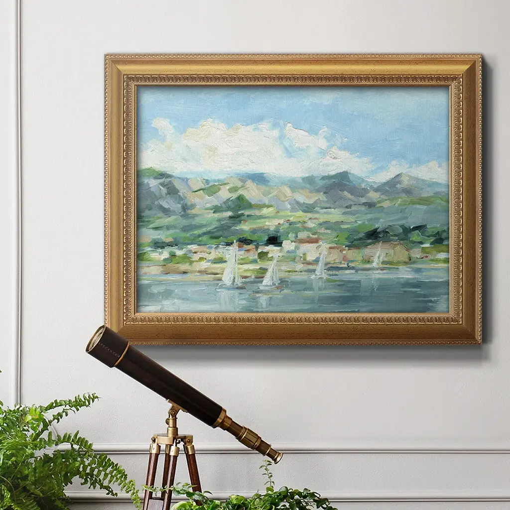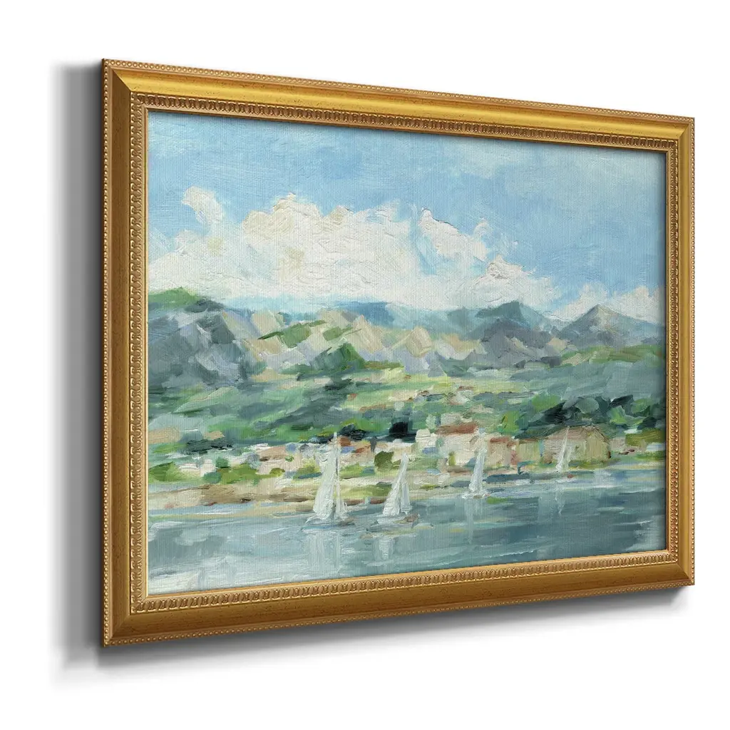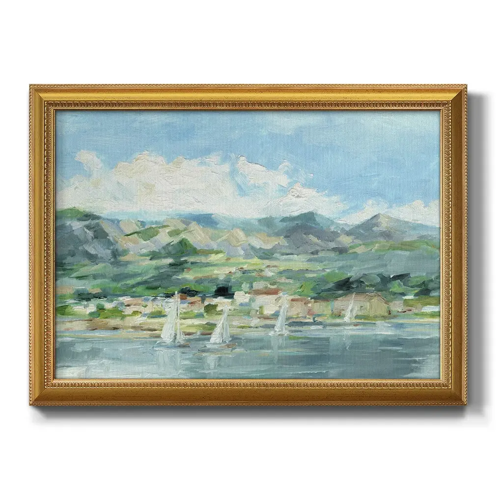 Sailing Along the Coast II Premium Framed Canvas- Ready to Hang A Premium Framed Canvas created to last. Framed in distressed wood and available in an array of sizes and colors Featuring a beveled a solid wood stretcher bar, each piece comes ready to hand 3 SIZES AVAILABLE 16''X20'' - Overall Size 18'X27'' - Overall Size 24''x36'' - Overall Size Each piece is made to order. Each piece comes with hanging hardware. Made in the USA Ready to Hang Giclee Paper Print Acrylic Glass Beveled Matt Board