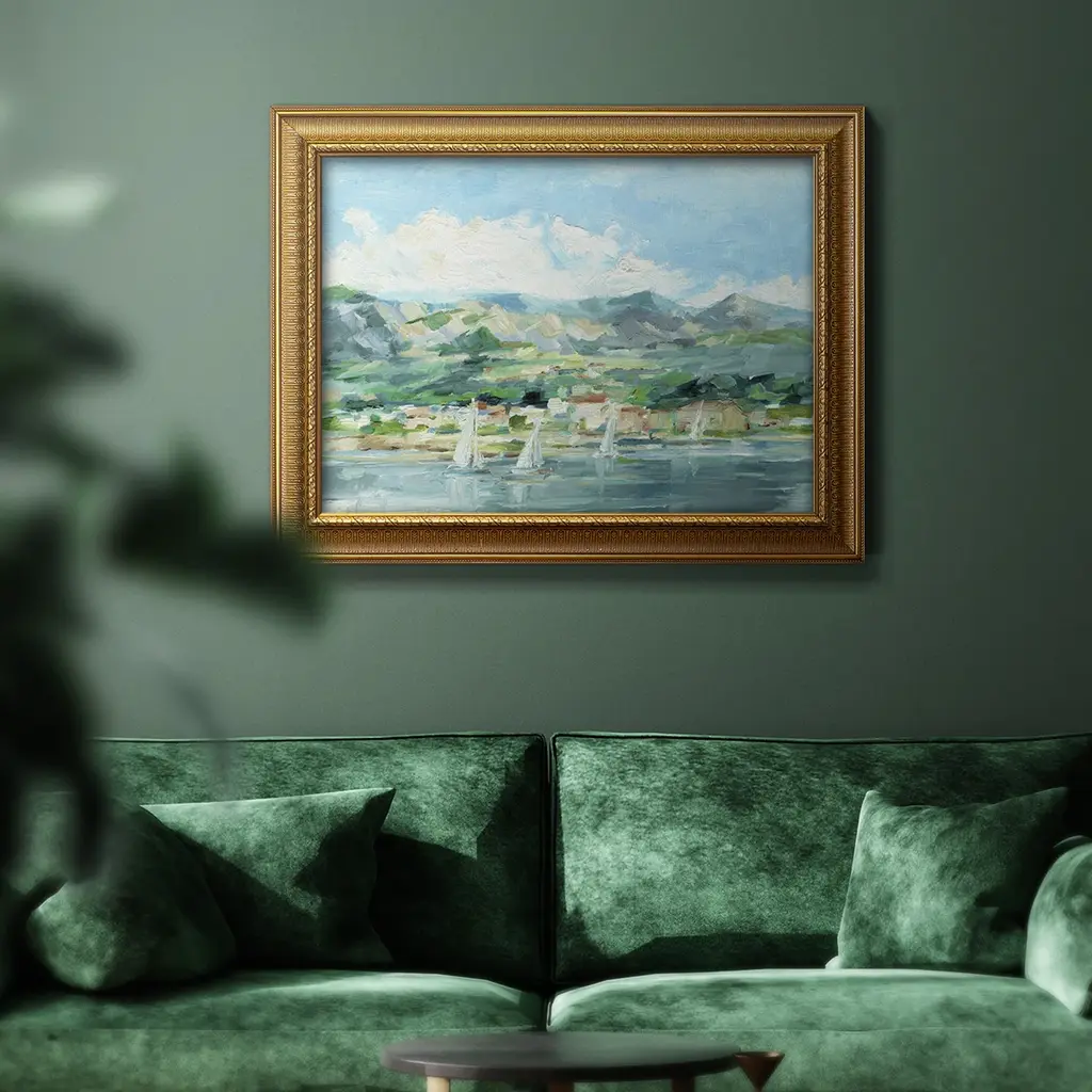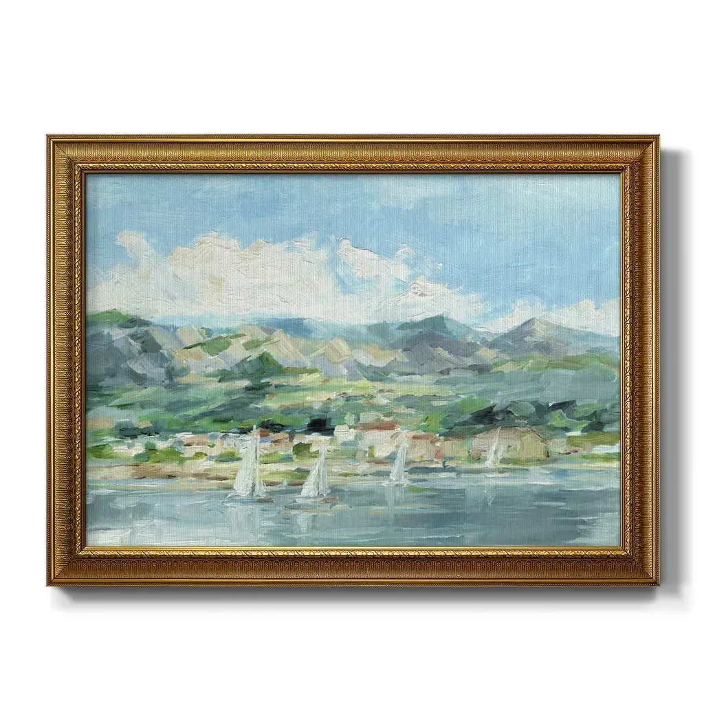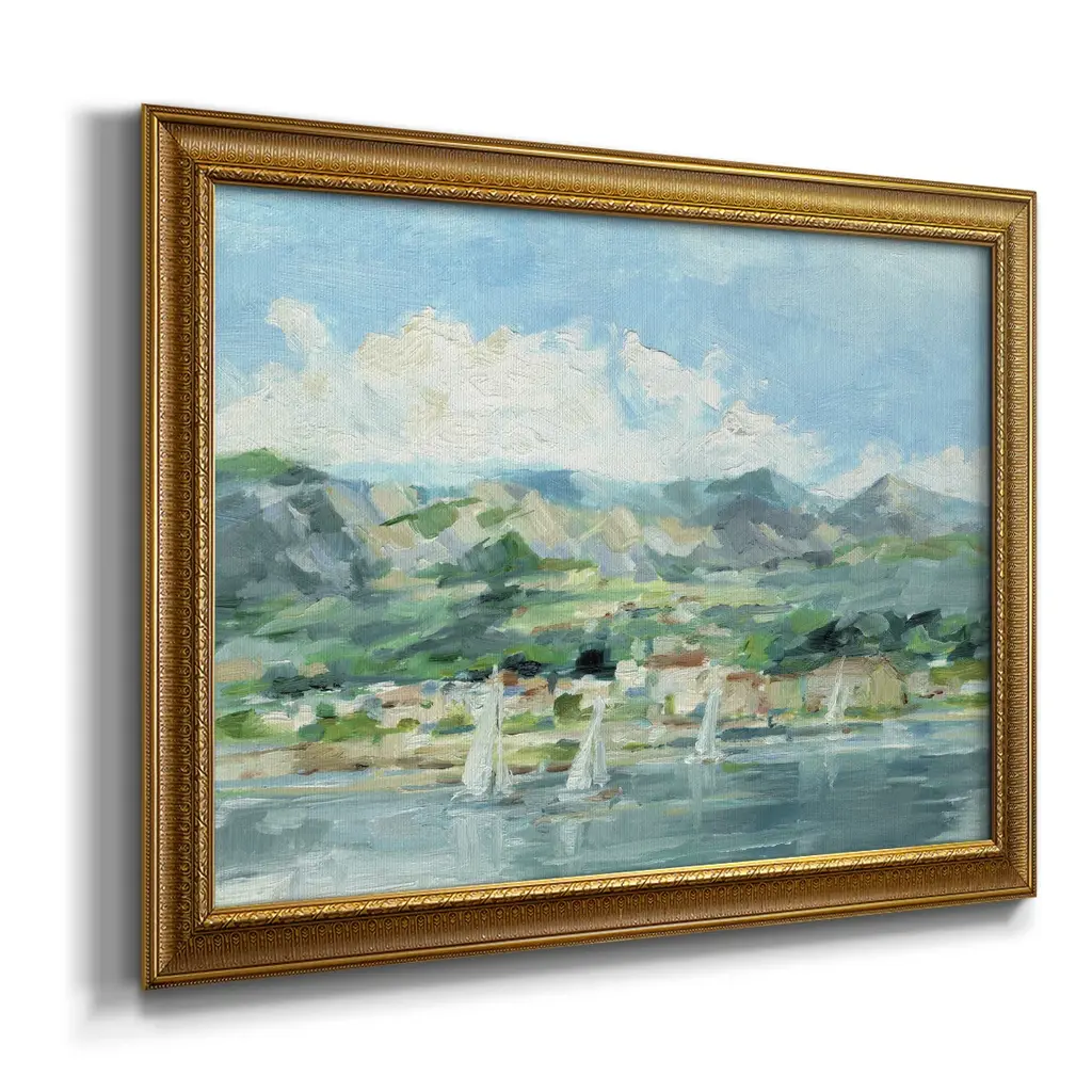 Sailing Along the Coast II Premium Framed Canvas- Ready to Hang A Premium Framed Canvas created to last. Framed in distressed wood and available in an array of sizes and colors Featuring a beveled a solid wood stretcher bar, each piece comes ready to hand 3 SIZES AVAILABLE 16''X20'' - Overall Size 18'X27'' - Overall Size 24''x36'' - Overall Size Each piece is made to order. Each piece comes with hanging hardware. Made in the USA Ready to Hang Giclee Paper Print Acrylic Glass Beveled Matt Board