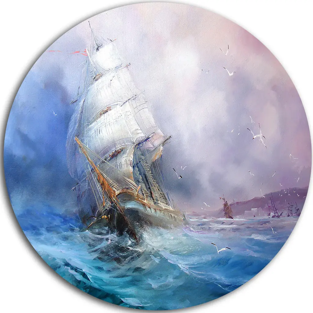 Sailing Boat, Seascape Painting Round Metal Wall Art, 38"