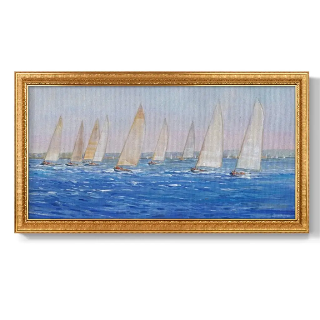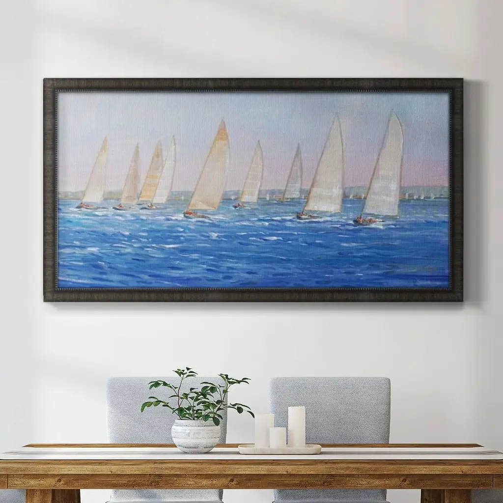 Sailing Event I Premium Framed Canvas- Ready to Hang A Premium Framed Canvas created to last. Framed in distressed wood and available in an array of sizes and colors Featuring a beveled a solid wood stretcher bar, each piece comes ready to hand 3 SIZES AVAILABLE 21''X37'' - Overall Size 25''X45'' - Overall Size 29''x53'' - Overall Size Each piece is made to order. Each piece comes with hanging hardware. Made in the USA Ready to Hang Giclee Paper Print Acrylic Glass Beveled Matt Board