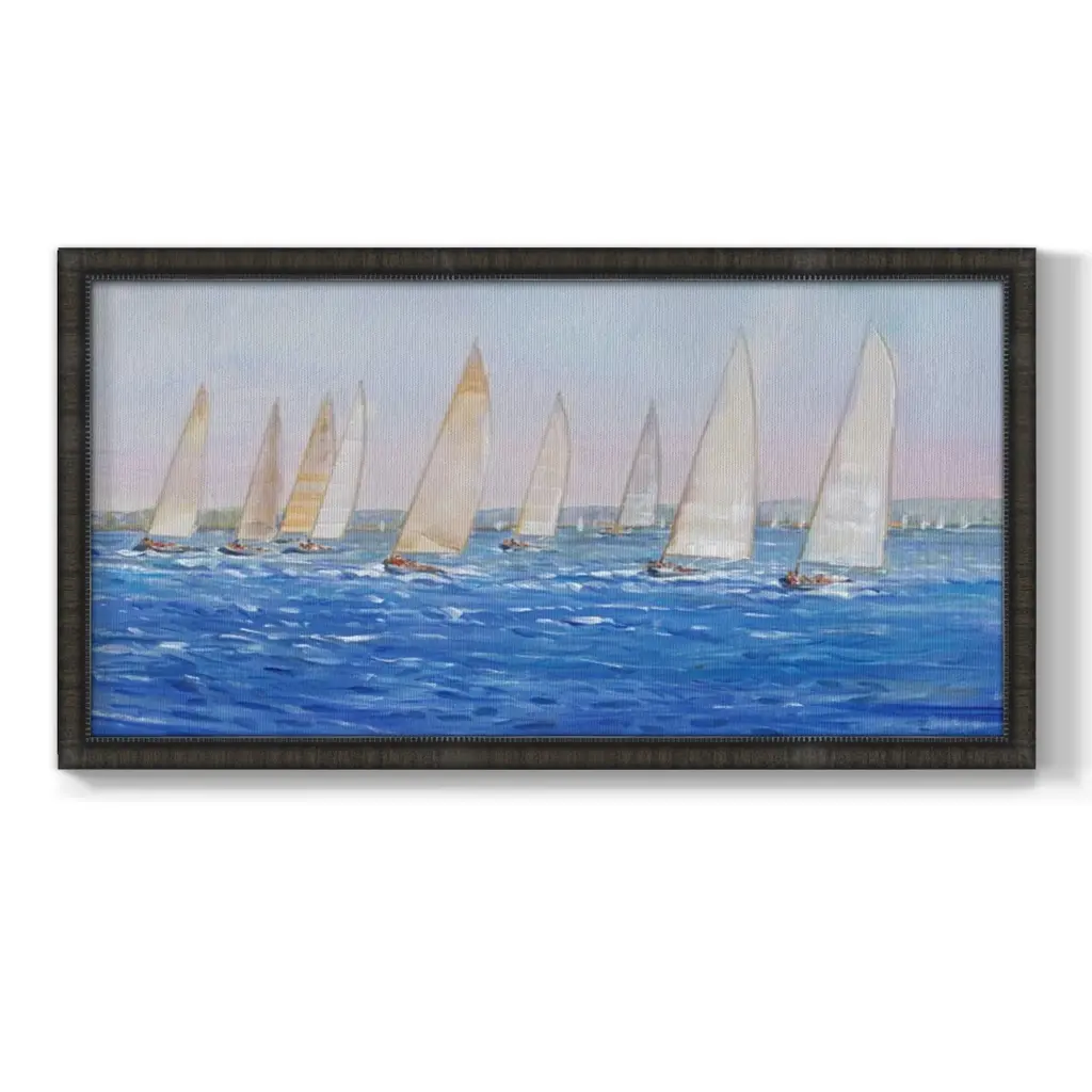 Sailing Event I Premium Framed Canvas- Ready to Hang A Premium Framed Canvas created to last. Framed in distressed wood and available in an array of sizes and colors Featuring a beveled a solid wood stretcher bar, each piece comes ready to hand 3 SIZES AVAILABLE 21''X37'' - Overall Size 25''X45'' - Overall Size 29''x53'' - Overall Size Each piece is made to order. Each piece comes with hanging hardware. Made in the USA Ready to Hang Giclee Paper Print Acrylic Glass Beveled Matt Board