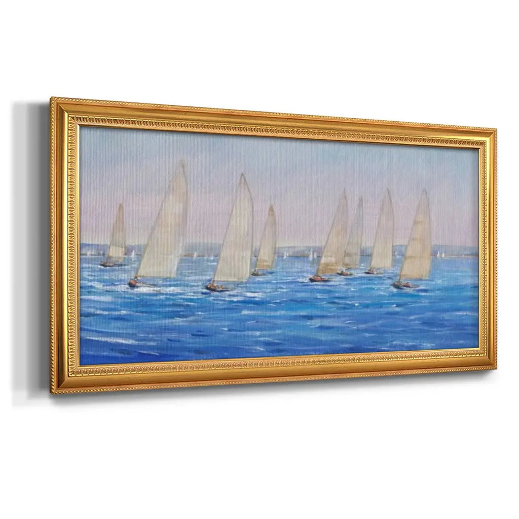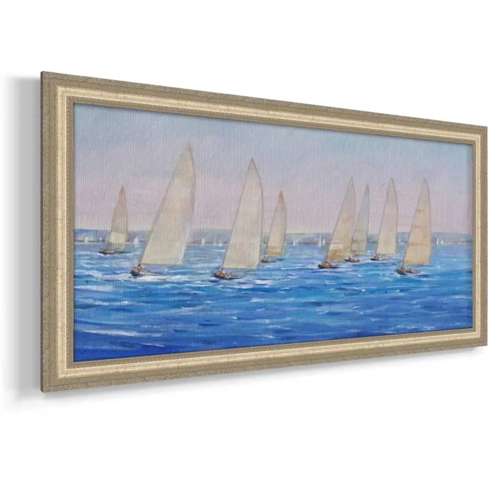Sailing Event II Premium Framed Canvas- Ready to Hang A Premium Framed Canvas created to last. Framed in distressed wood and available in an array of sizes and colors Featuring a beveled a solid wood stretcher bar, each piece comes ready to hand 3 SIZES AVAILABLE 21''X37'' - Overall Size 25''X45'' - Overall Size 29''x53'' - Overall Size Each piece is made to order. Each piece comes with hanging hardware. Made in the USA Ready to Hang Giclee Paper Print Acrylic Glass Beveled Matt Board