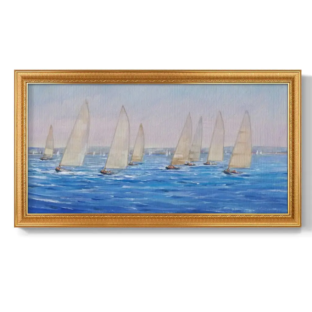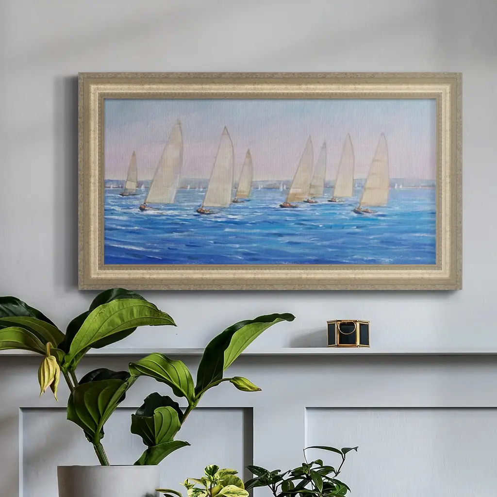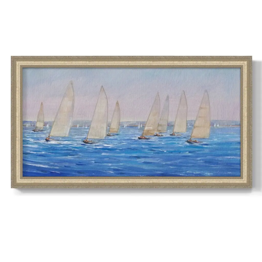 Sailing Event II Premium Framed Canvas- Ready to Hang A Premium Framed Canvas created to last. Framed in distressed wood and available in an array of sizes and colors Featuring a beveled a solid wood stretcher bar, each piece comes ready to hand 3 SIZES AVAILABLE 21''X37'' - Overall Size 25''X45'' - Overall Size 29''x53'' - Overall Size Each piece is made to order. Each piece comes with hanging hardware. Made in the USA Ready to Hang Giclee Paper Print Acrylic Glass Beveled Matt Board