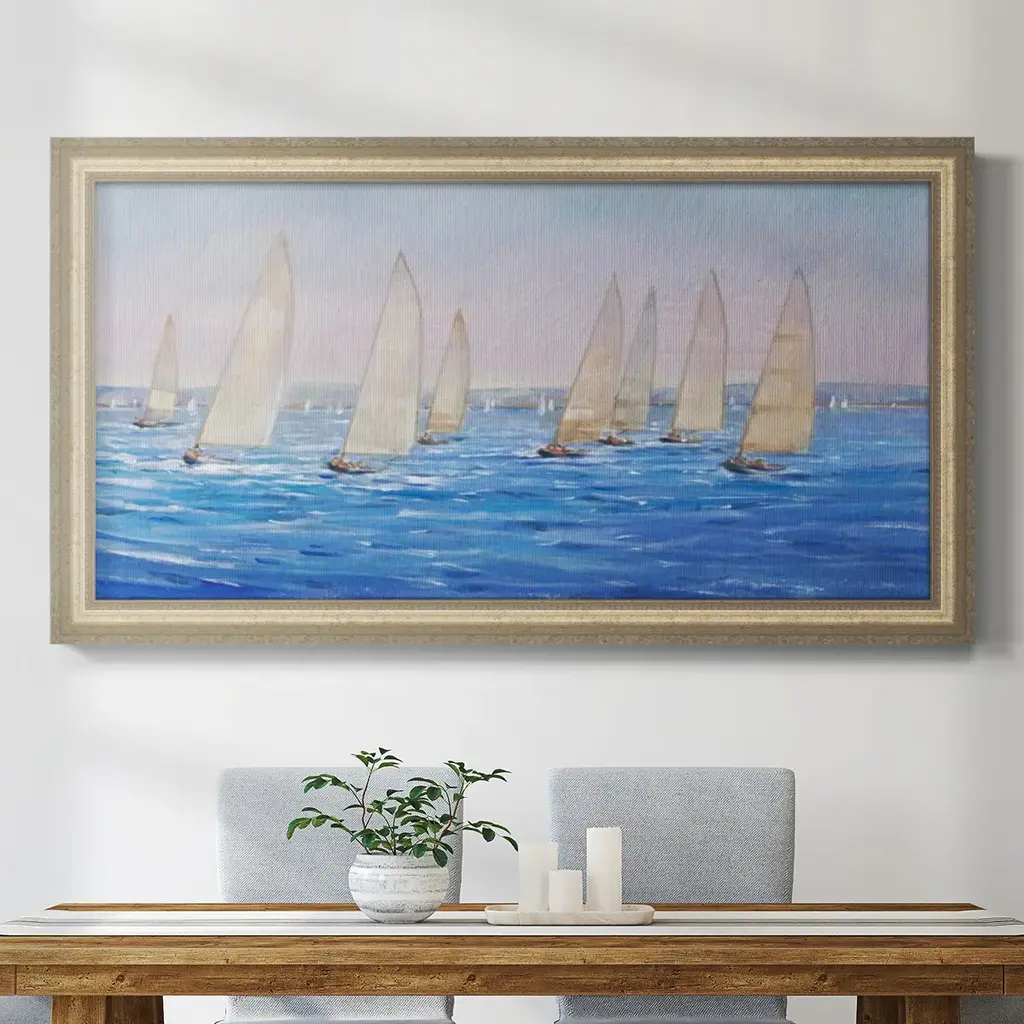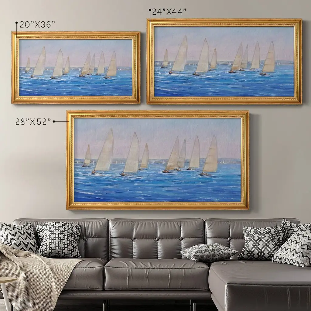 Sailing Event II Premium Framed Canvas- Ready to Hang A Premium Framed Canvas created to last. Framed in distressed wood and available in an array of sizes and colors Featuring a beveled a solid wood stretcher bar, each piece comes ready to hand 3 SIZES AVAILABLE 21''X37'' - Overall Size 25''X45'' - Overall Size 29''x53'' - Overall Size Each piece is made to order. Each piece comes with hanging hardware. Made in the USA Ready to Hang Giclee Paper Print Acrylic Glass Beveled Matt Board