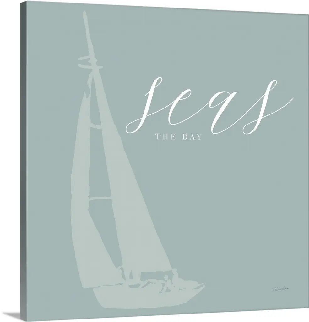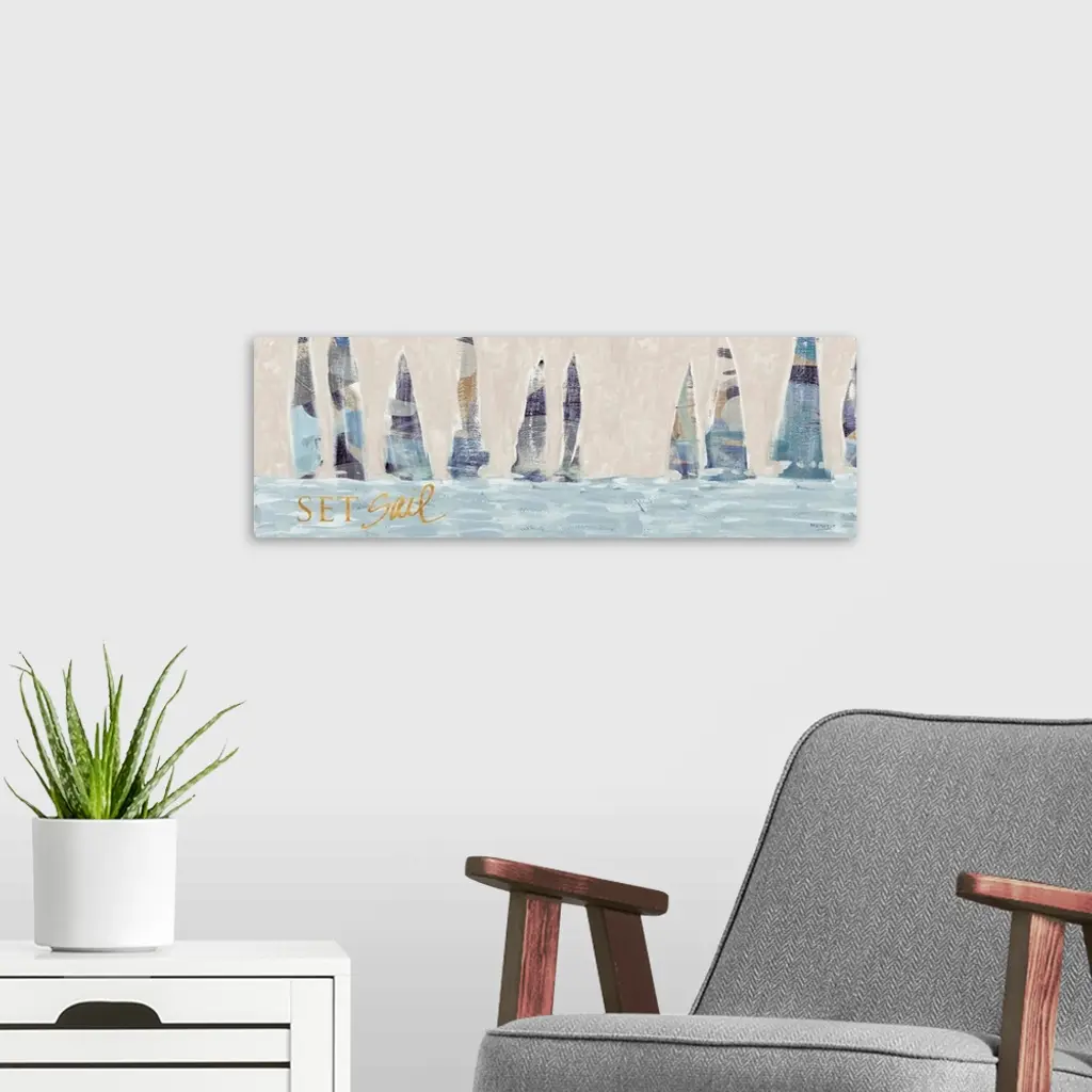 A contemporary abstract painting of ten sailboats on the water with blue, muted tones and the phrase "Set Sail" written in gold at the bottom.