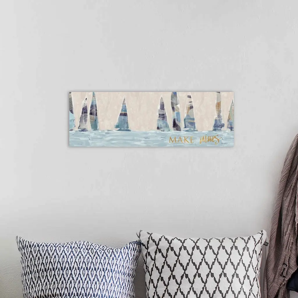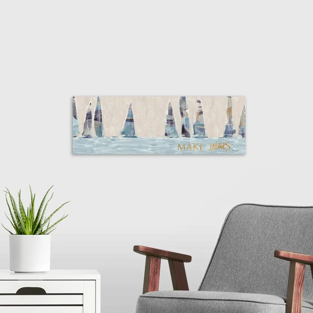 A contemporary abstract painting of nine sailboats on the water with blue, muted tones and the phrase "Make Waves" written in gold at the bottom.