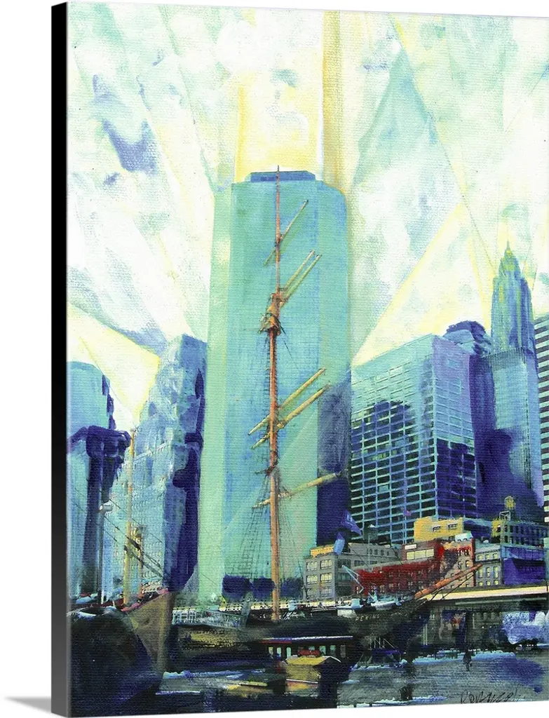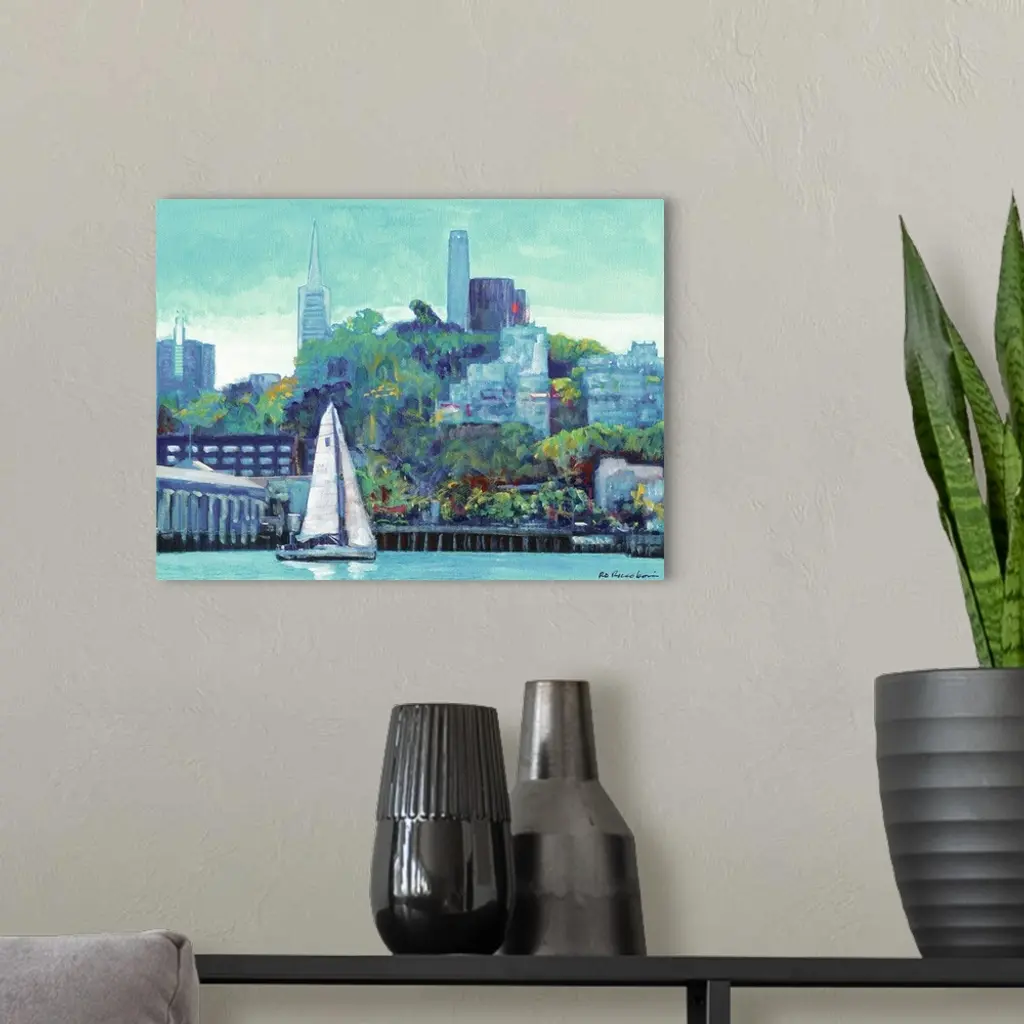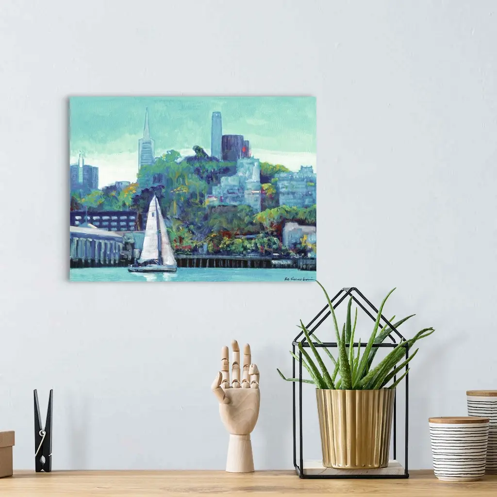 Contemporary painting of a sailboat sailing by Pioneer Park and Coit Tower in San Francisco California.