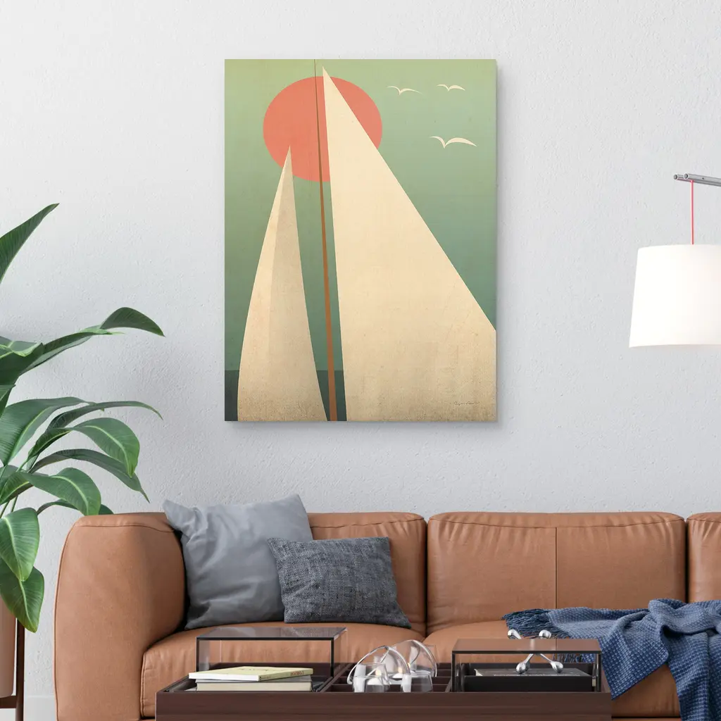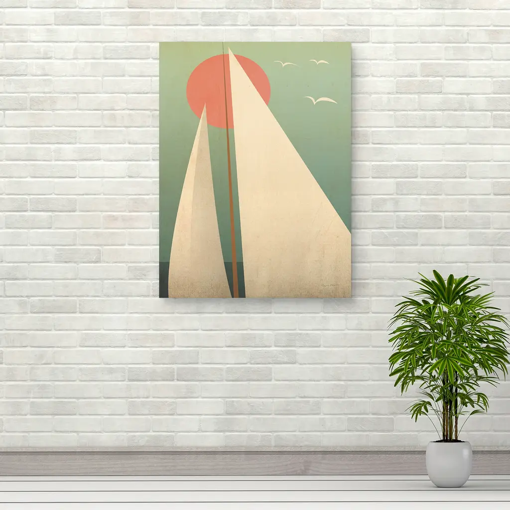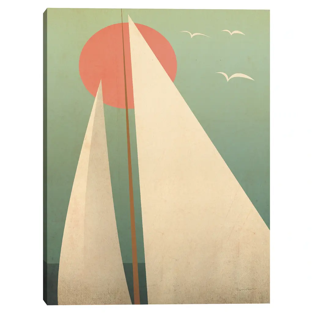 Graphic artist Ryan Fowler is an illustrator, photographer, and graphic designer. Sails III is Ryan's interpretation of a cloudless day on the sea with a sailboat being gently taken by the wind. This modern abstract nautical jewel is Gallery-Wrapped and gives any room an airy feel.