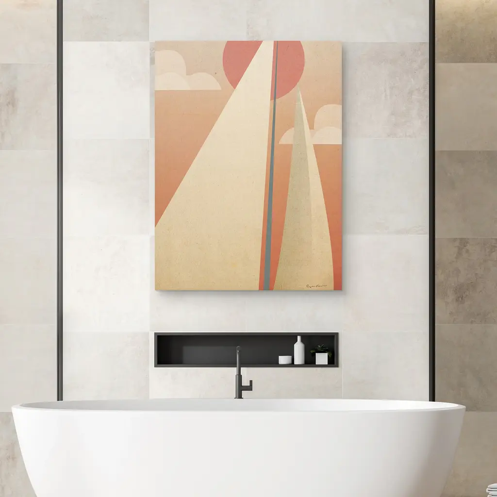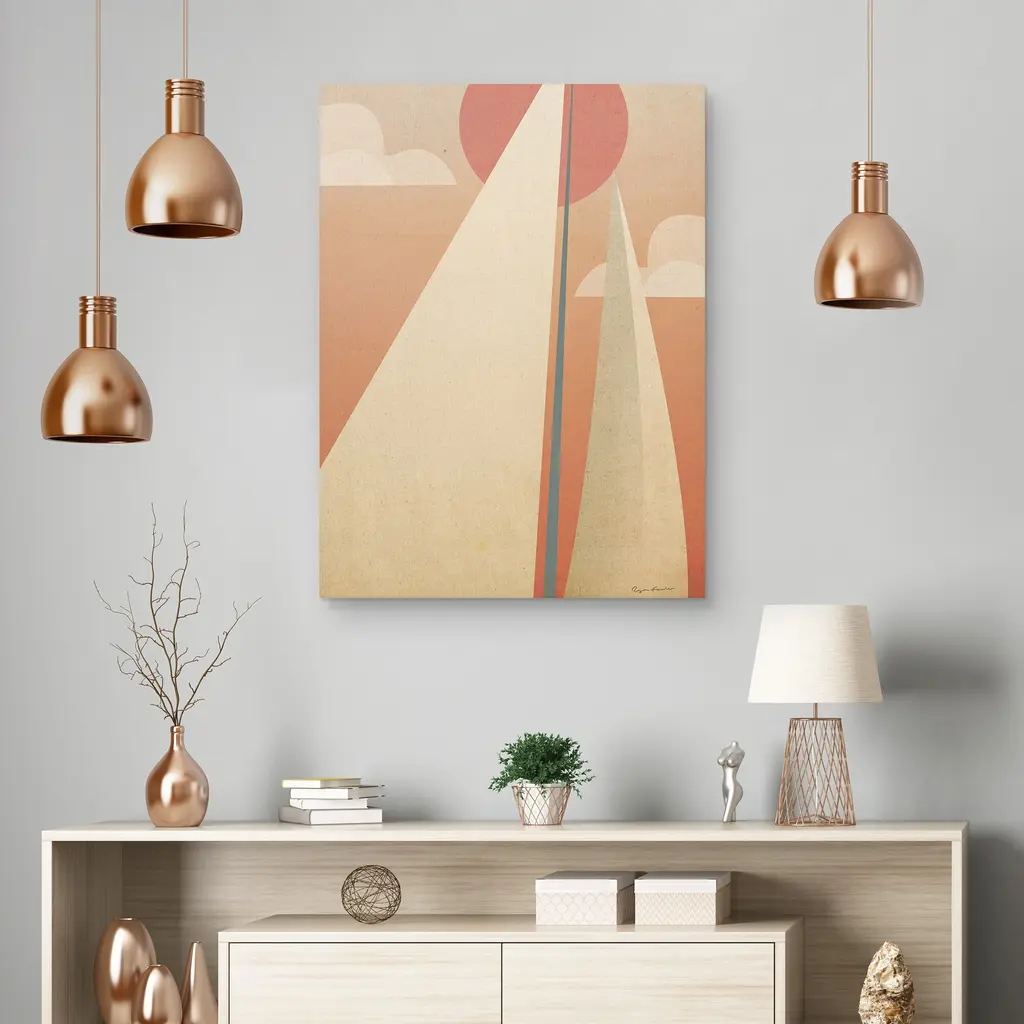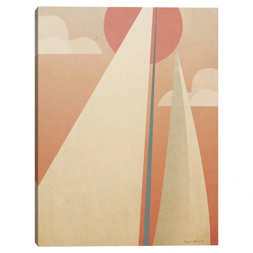 Graphic artist Ryan Fowler is an illustrator, photographer, and graphic designer. Sails III is Ryan's interpretation of a late afternoon on the sea with a sailboat being gently taken by the wind. This modern abstract nautical jewel is Gallery-Wrapped and gives any room an airy feel.