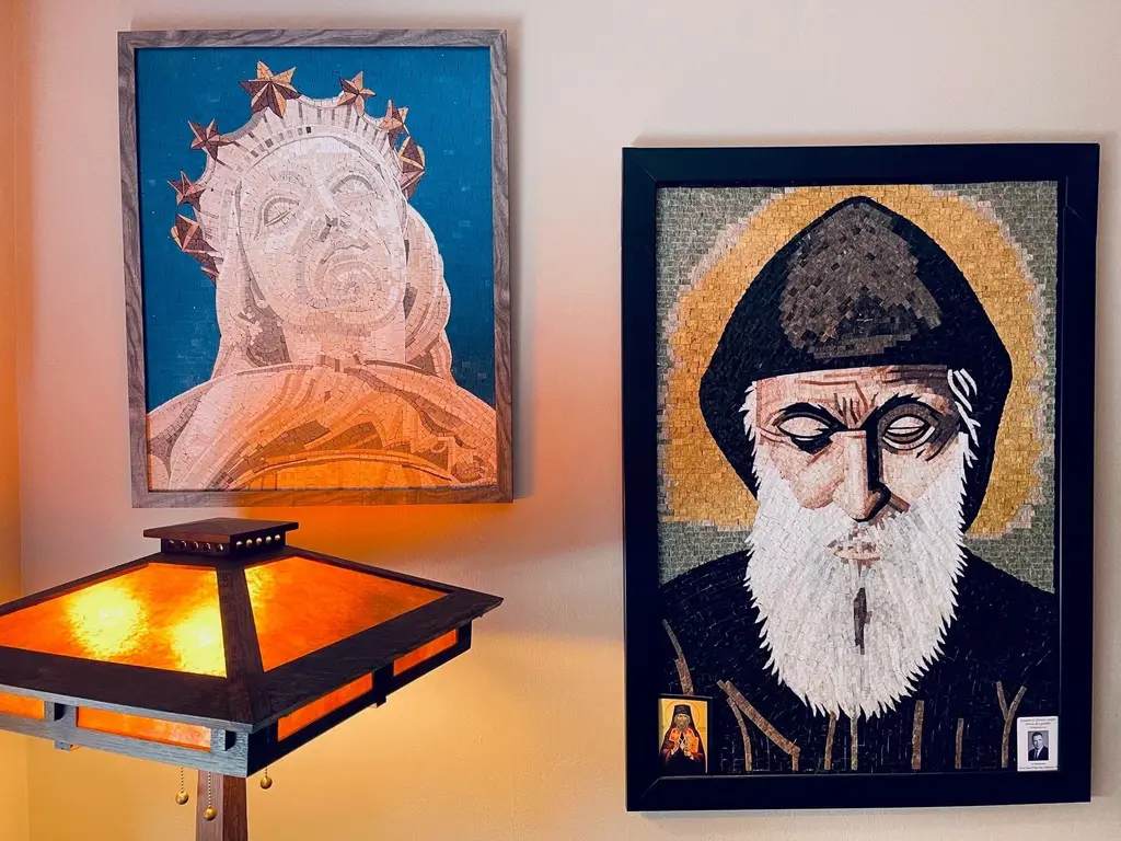 Introducing the Saint Charbel Icon Mosaic, a stunning piece of Religious Mural Art of Mosaics that beautifully combines spirituality and craftsmanship. This exquisite hand-made marble mosaic icon pays tribute to Saint Charbel, a revered Lebanese figure known for his profound spiritual legacy. Saint Charbel, a 19th-century monk, is celebrated for his miraculous healing powers and his life dedicated to prayer and solitude. After his passing, an array of mysterious lights was witnessed illuminating his grave, captivating the hearts of many believers and pilgrims. The authenticity of his sanctity was further confirmed when a formal committee, including medical professionals, examined his well-preserved body, leading to an increase in miraculous healings attributed to him.This remarkable mosaic not only serves as a decorative piece, but also as a source of inspiration and faith. Crafted from all-natural stones and hand-cut tiles, each piece is meticulously designed to depict the serene image of Saint Charbel. The intricate details captured in this mural art reflect the dedication of skilled artisans, providing a unique and sacred ambiance to any space.The Saint Charbel Icon Mosaic is more than just a beautiful artwork; it is a testament to the miracles and faith that have drawn countless pilgrims from diverse backgrounds to the Annaya Monastery. Whether you are a devoted follower or simply appreciate breathtaking art, this mosaic serves as a connection to the divine and a reminder of the extraordinary stories surrounding this beloved saint.Enhance your home or sacred space with the Saint Charbel Icon Mosaic, a perfect blend of history, spirituality, and artistry. Let this remarkable piece inspire devotion, reflection, and admiration for the miraculous journey of Saint Charbel and the enduring power of faith. Embrace the essence of Religious Mural Art of Mosaics with this timeless icon, worthy of reverence and placement in your spiritual sanctuary.
