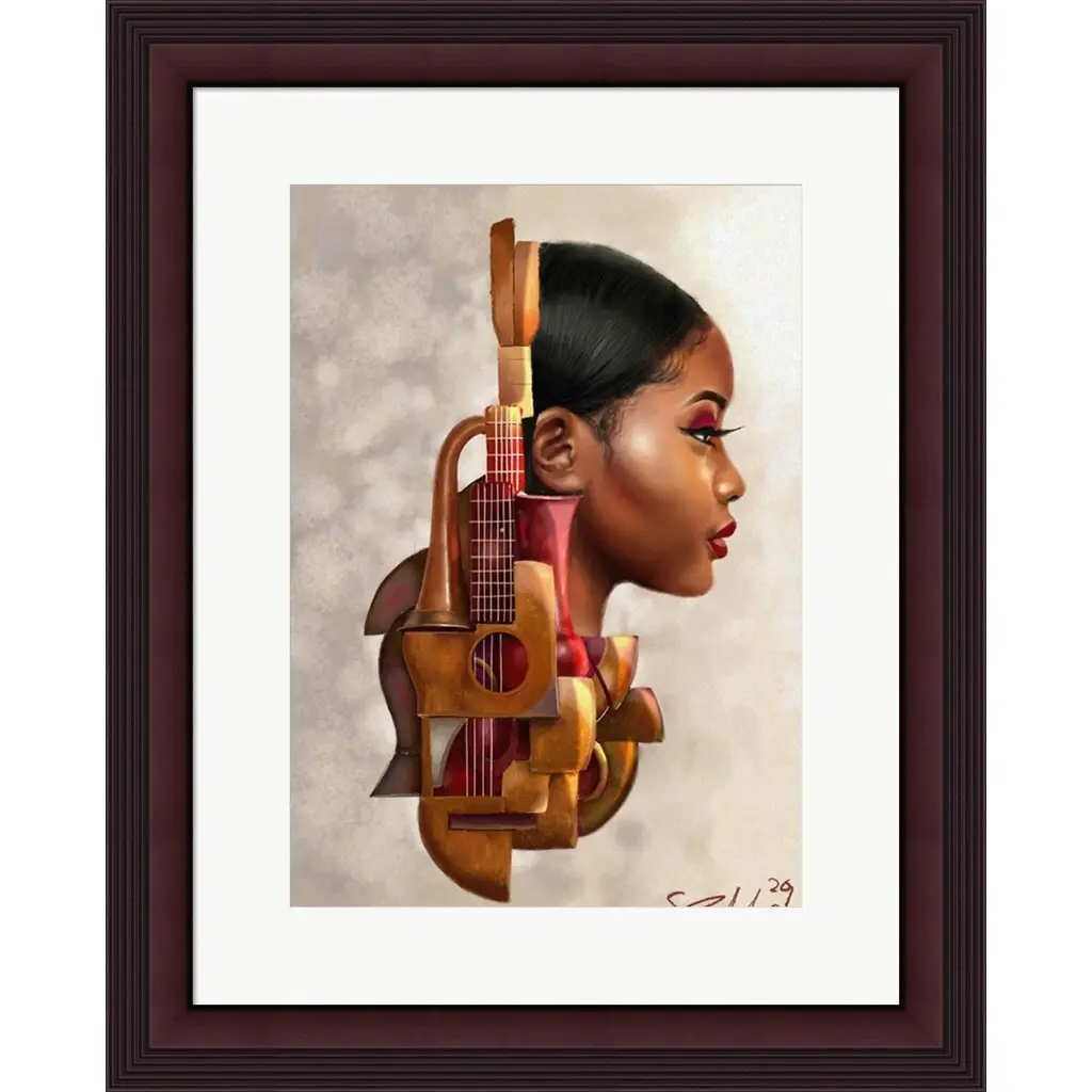 Mahogany Strings by Salaam Muhammad is a high quality piece of framed artwork. The finished size of this piece is 20" x 25". It has a Cherry Stepped Front frame, White mat and is finished with high quality Acrylic Plexiglass. 100% Satisfaction Guaranteed.