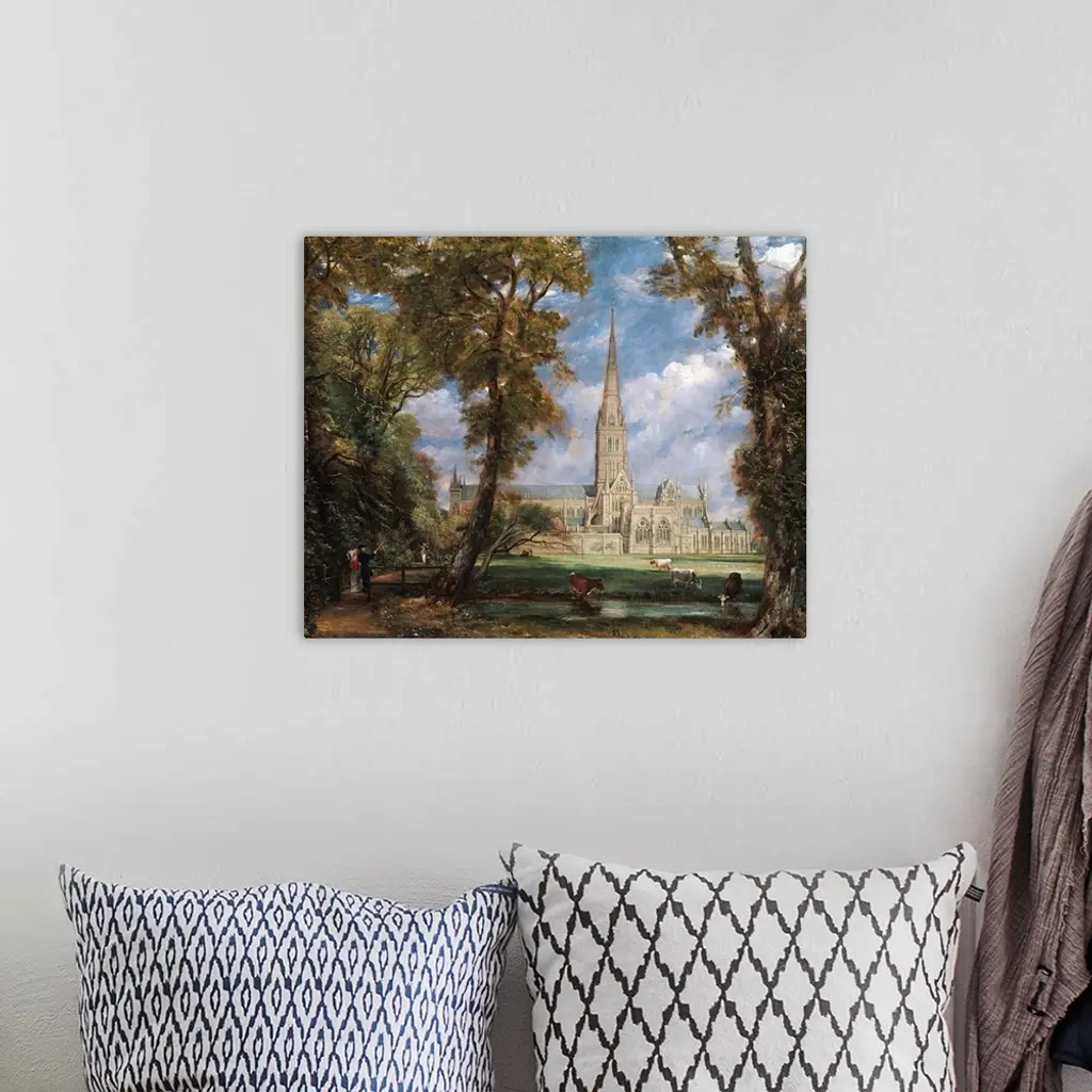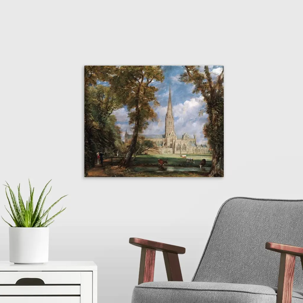 This painting was made as a full-scale study for the picture of 1826 now in the Frick Collection, New York. The latter picture was completed for Constable's friend John Fisher, bishop of Salisbury, who appears at lower left in both canvases. In fact the commission dates back to 1822; in the course of working on the composition, Constable opened up the tree canopy and added a sunny sky to frame the cathedral's medieval spire, the tallest in England.