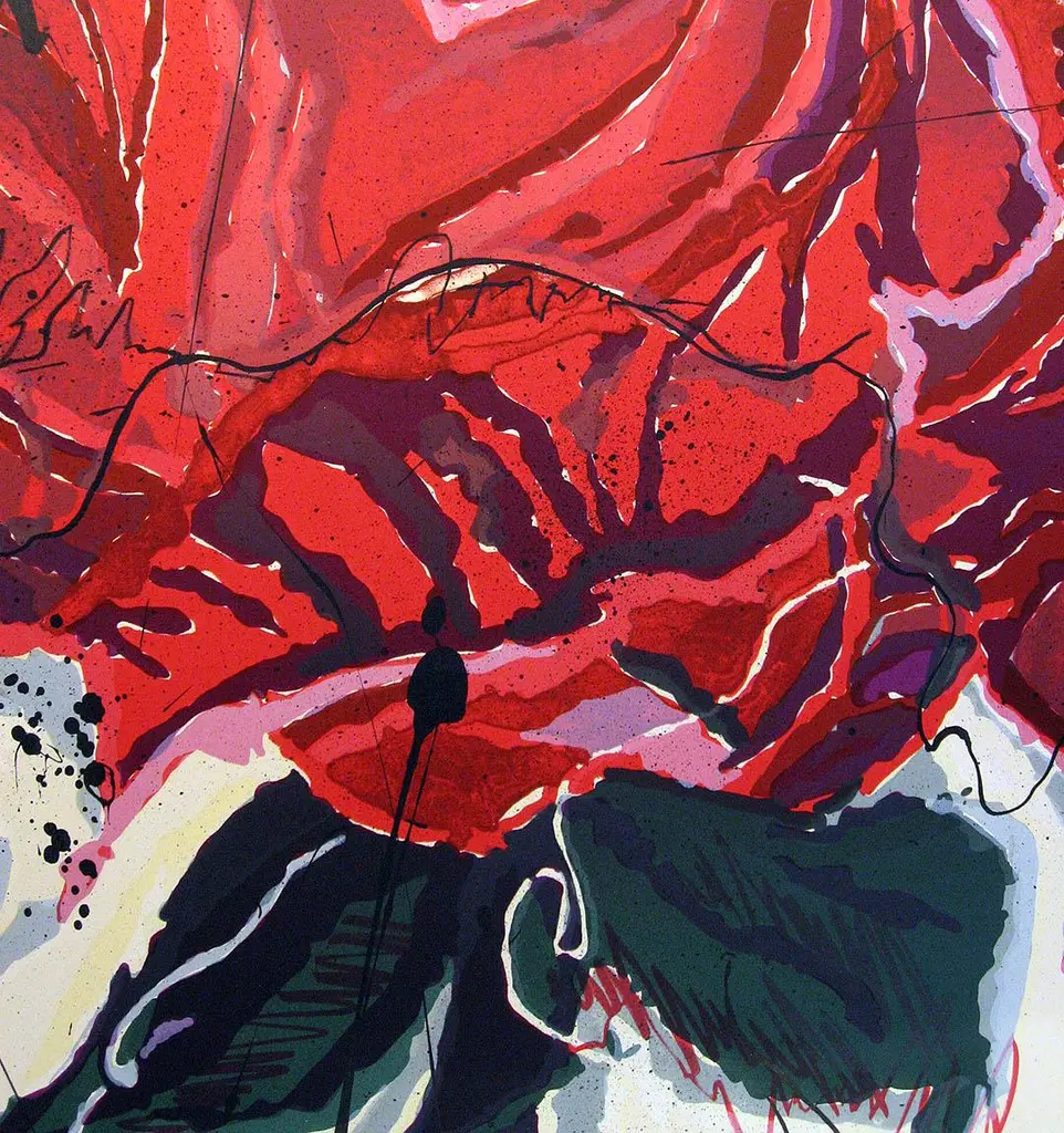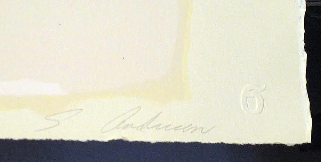 Impressionistic limited edition lithograph art print on paper of a red rose by American artist Sally Anderson. Hand signed, titled and numbered by the artist in pencil. Paper Size: 28" x 36". Edition size of 100. Circa 1980s. Condition of the lithograph is Mint. 100 percent guarantee of authenticity. Certificate of Authenticity is included. Make an offer! Artist bio: SALLY ANDERSON Although Sally Anderson had achieved national prominence with her creations in woven sculpture, she was not content to continue working with that medium simply because of the success it brought her. After weaving for 10 years, she found that her work was beginning to frustrate, rather than to excite her, and she turned to painting and lithography. Since then, Anderson has received national recognition for her work in those media as well. Born and raised in Wisconsin, Anderson was the eldest of five children. A shy and sensitive girl, she would spend hours creating puppet shows for which she painted and costumed clothespins, designed cardboard scenery, and made up the scripts but she would perform only for her family. In junior high school, without her knowledge, Anderson's art teacher entered two of her pieces in a newspaper contest, and Anderson won. Her parents, impressed with her talent, enrolled her in art school, but Anderson soon quit because she was too shy to let anyone see her work. The shyness gradually dissipated, and Anderson went on to earn a Bachelor of Arts degree from Beloit College in Wisconsin, and to do graduate work at the University of Wisconsin and the Instituto de Allende in Mexico. During the years when she worked solely in abstract fiber sculpture, Anderson won two National Endowment for the Arts grants and several major federally-supported commissions. She now devotes all of her time to painting, producing abstract works that employ paint and a variety of other media. The results are brightly-colored creations with energetic splashes of shapes and designs. "I build up large gessoed canvases in different layers," explains Anderson. "Then I tape off the edges and apply tiny lines of differing angles and colors. Next, I use a large brush to randomly splash colors." She continues taping over areas and applying paint, until she has built up several layers of acrylic. When she removes the tape, Anderson often adds torn pieces of handmade paper, foil, thread, or gold leaf and then uses a squeeze bottle filled with paint to add tiny action lines, other marks, and occasionally, a minute figure. "I want my paintings to excite the senses," Anderson declares. "The viewer can play 'find the hidden picture' or just drink in the harmony between the explosion and the ordered energy on the canvas. I want to create works that have energy, movement, and intensity of color, but that also -- upon closer examination have an academic control." Anderson is listed in Who's Who in American Art, and her works have been featured in countless one-person exhibitions throughout the country. They are also displayed in numerous collections, including Saks Fifth Avenue; the Bundy Museum; Spellman Investment Company; and Honeywell, Incorporated, to name just a few.