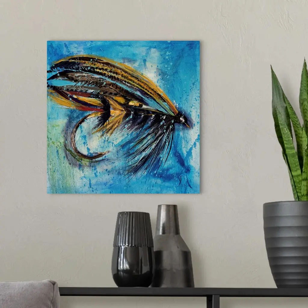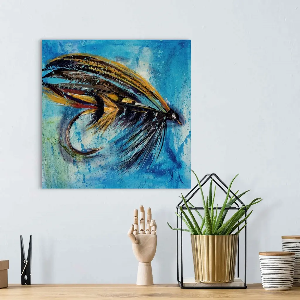 Square painting of an orange, red, and black fly fishing lure on a blue and green background.