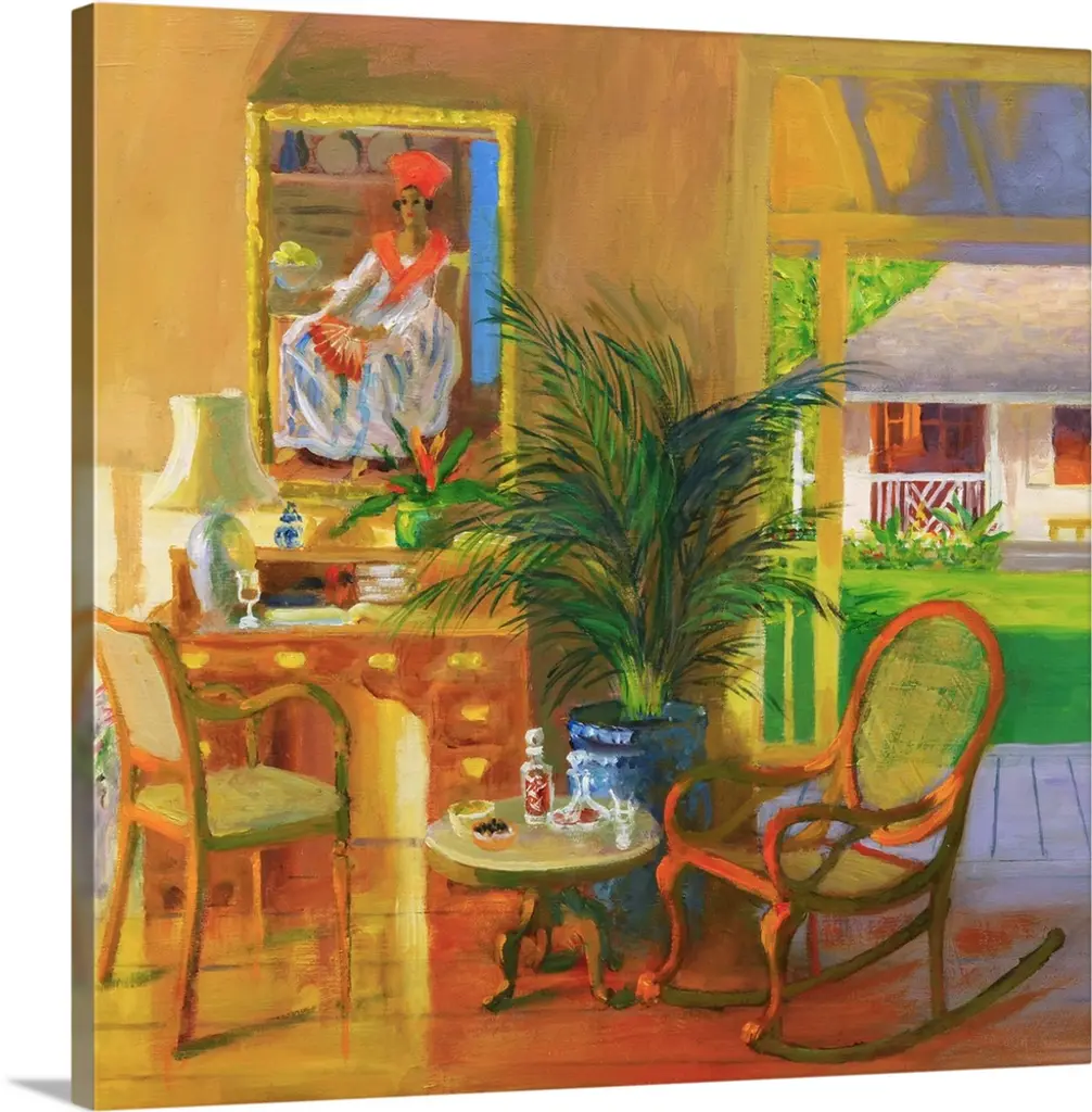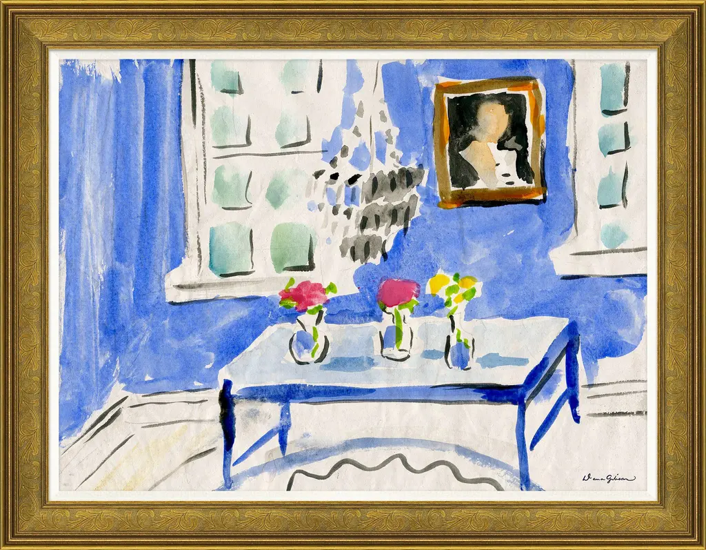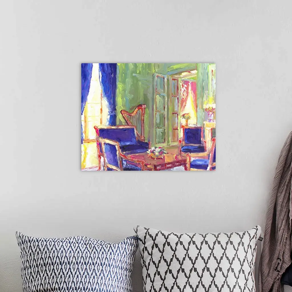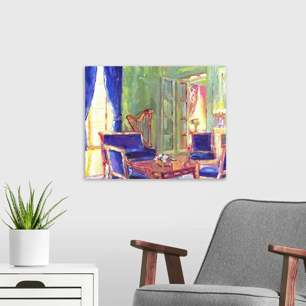 Contemporary colorful painting of a salon with fancy blue furniture and a harp.
