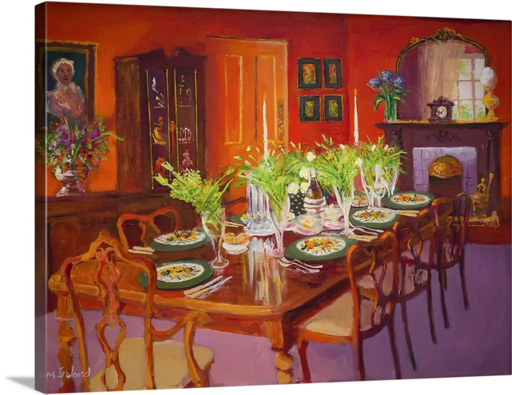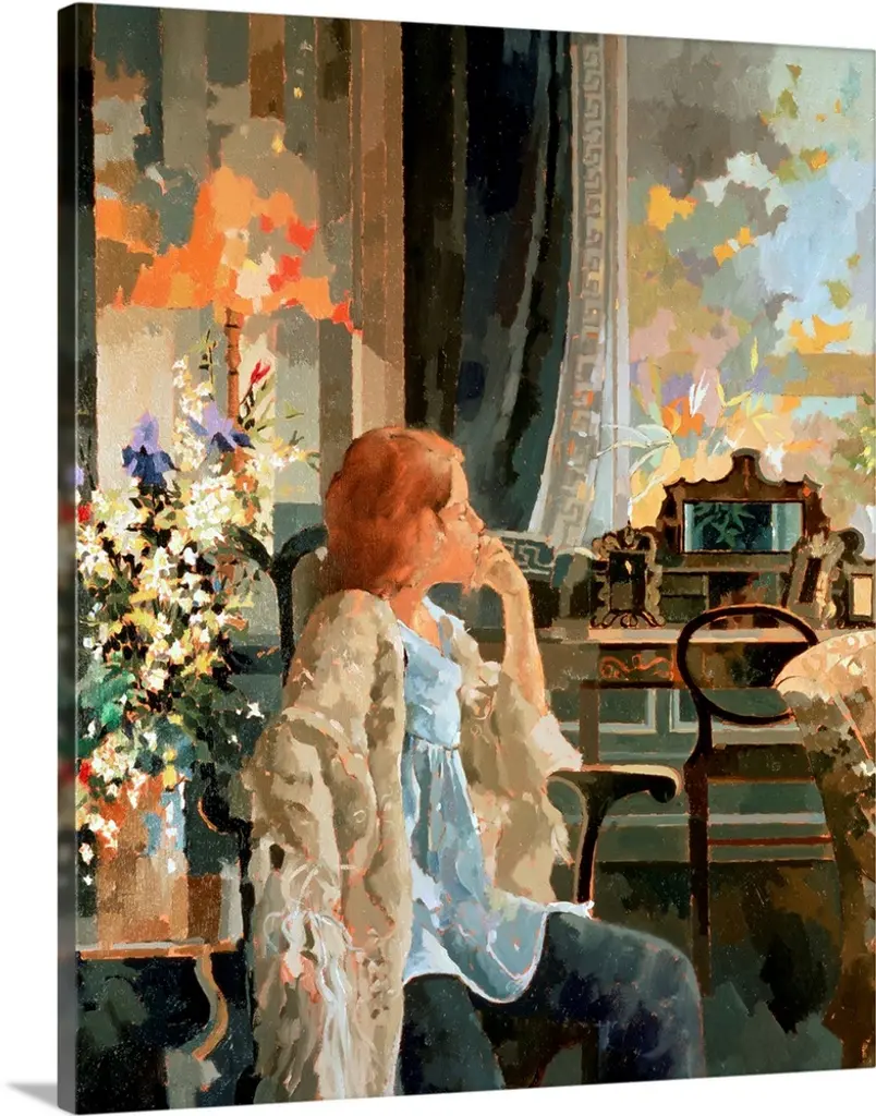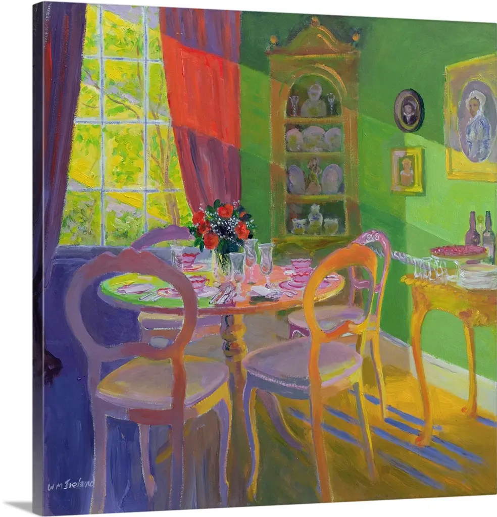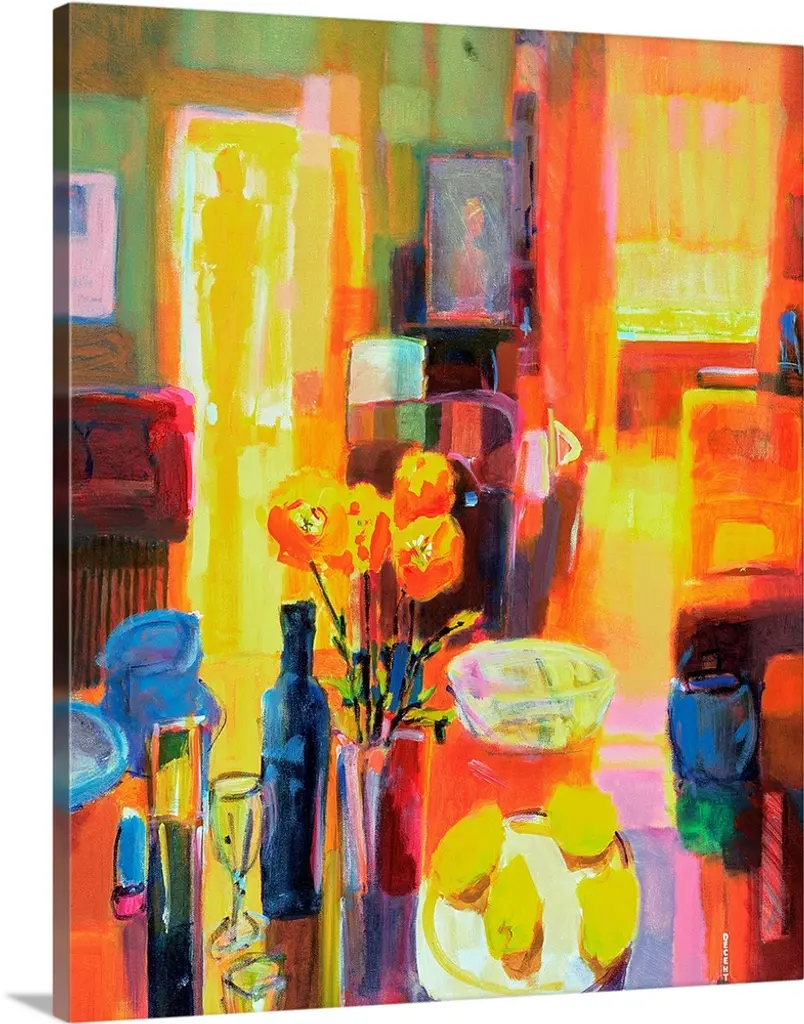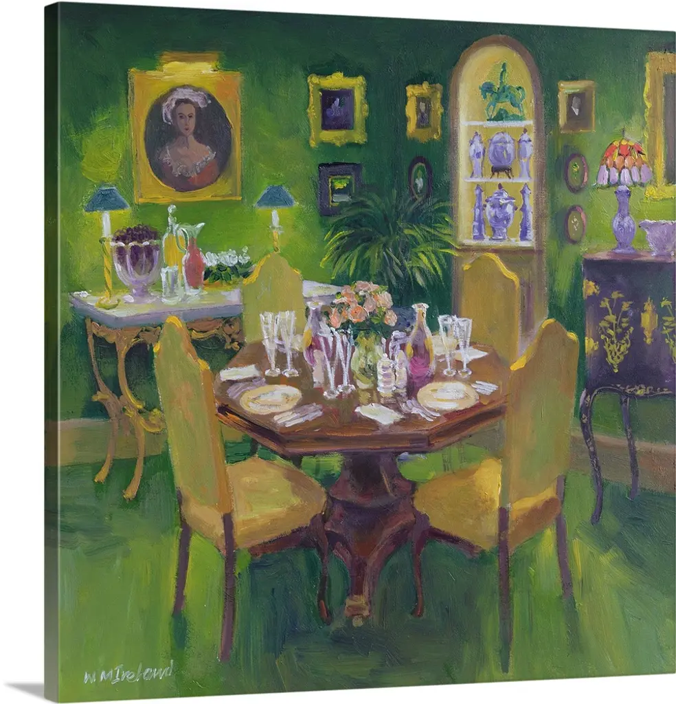 Contemporary colorful painting of a salon with fancy blue furniture and a harp.