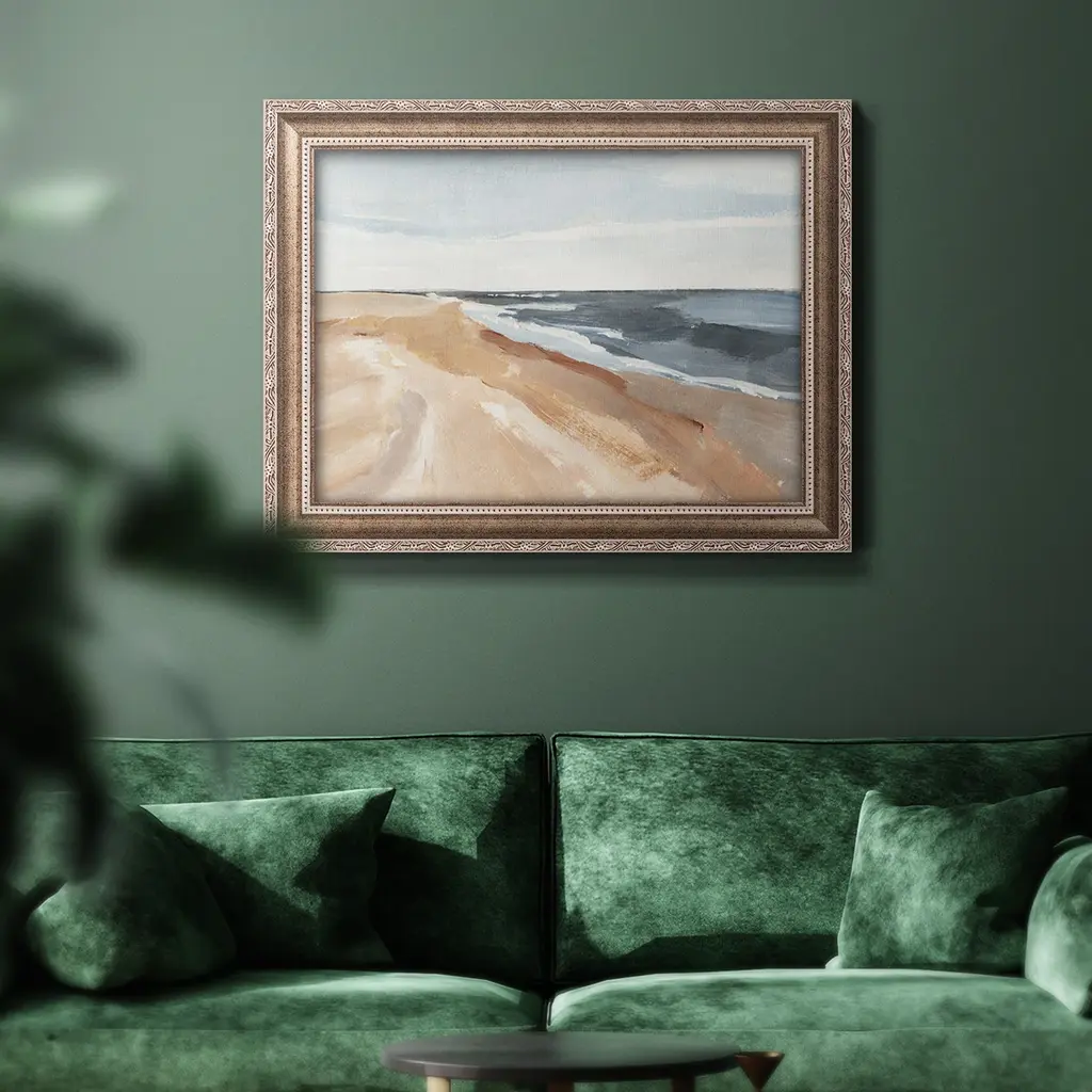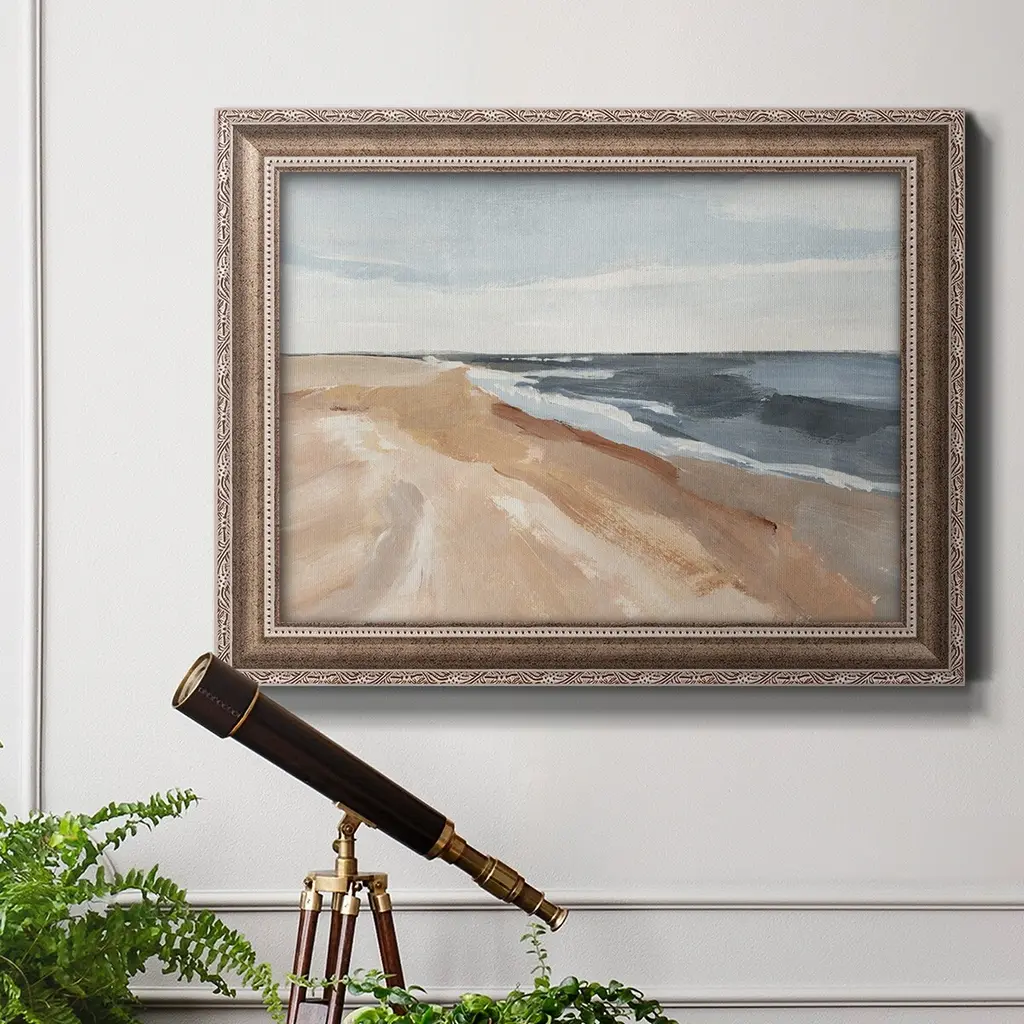Salvo Beach II Premium Framed Canvas- Ready to Hang A Premium Framed Canvas created to last. Framed in distressed wood and available in an array of sizes and colors Featuring a beveled a solid wood stretcher bar, each piece comes ready to hand 3 SIZES AVAILABLE 16''X20'' - Overall Size 18'X27'' - Overall Size 24''x36'' - Overall Size Each piece is made to order. Each piece comes with hanging hardware. Made in the USA Ready to Hang Giclee Paper Print Acrylic Glass Beveled Matt Board