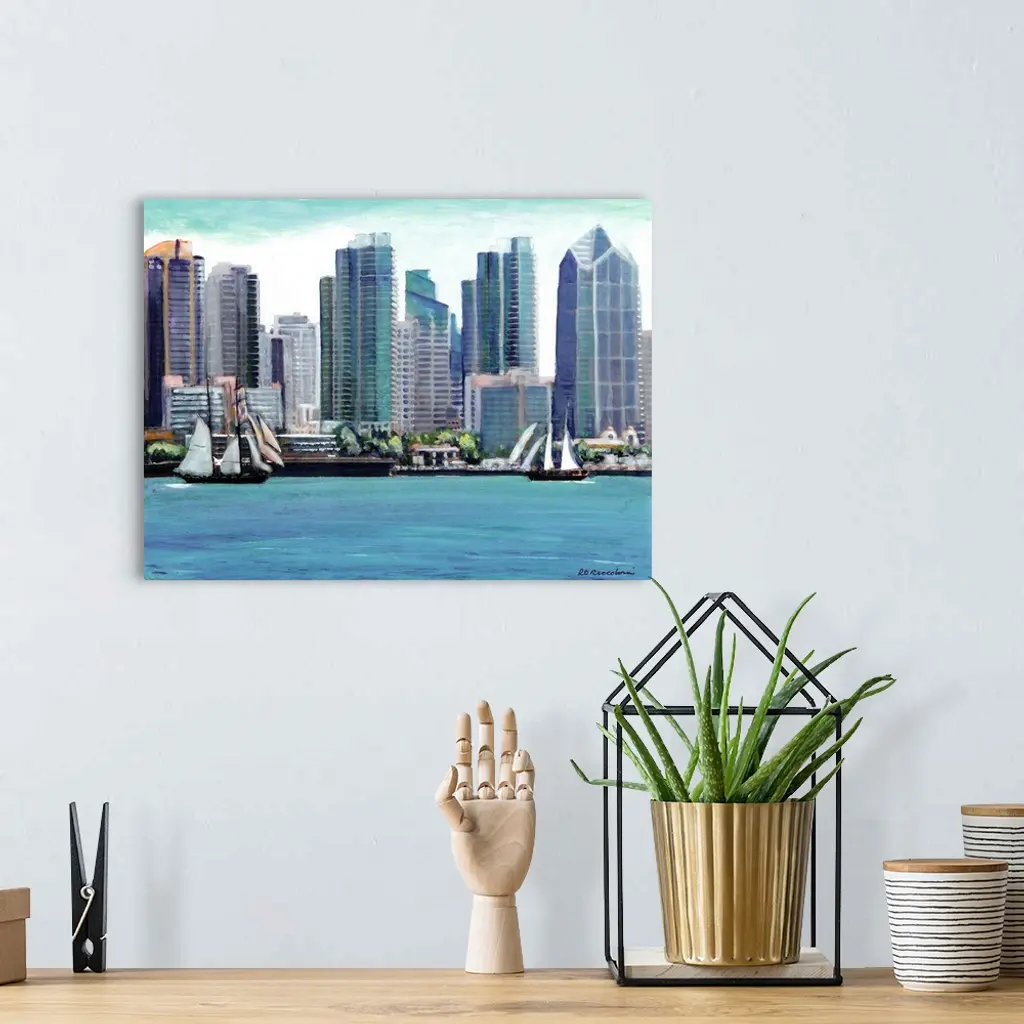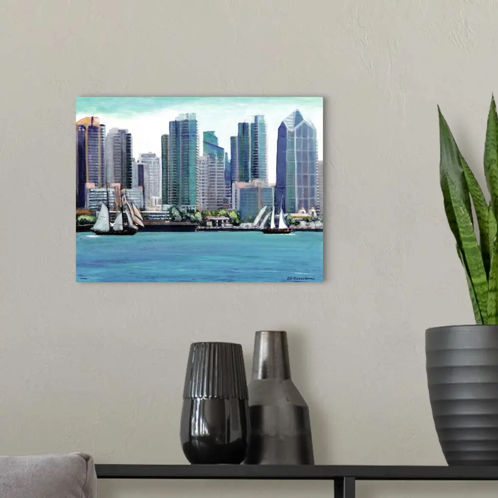 Contemporary painting of boats sailing in the San Diego Bay with the new skyline contrasting the old sailing ships based there at the Maritime Center.