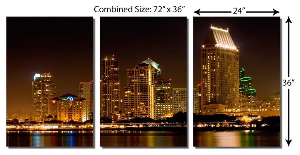 48"œ x 24"œ total size. Ready To Hang! (3 pieces - 16"œ x 24"œ each). 3 Panel Split (Triptych) Metal Print of San Diego skyline at night. Modern metal wall art for home or office wall decor & interior design. Printed on Luxurious, HD aluminum glossy metal panels. Multi panel art.. HD aluminum panels. Metal print wall art. Includes Shadow Wall Mount on the back.• Aluminum Metal Wall Art• Made in USA• Ready to hang - No assembly required• Shadow mount hardware on the back• 0.045"œ thick HD Aluminum Panels• Scratch resistant, glossy finish• Superb color clarity, luxurious prints• Epson printing process• For indoor or moisture rich environment use• Easy to clean. Gently wipe with microfiber cloth.