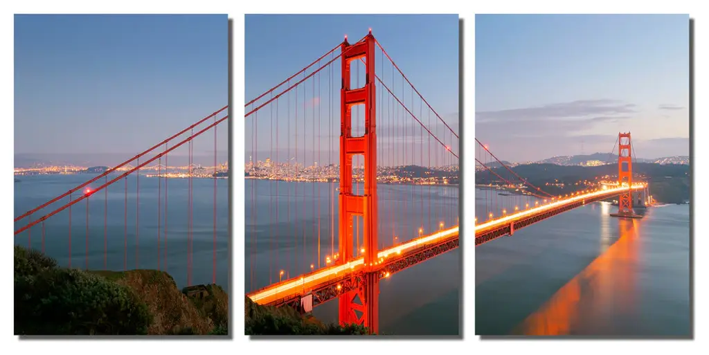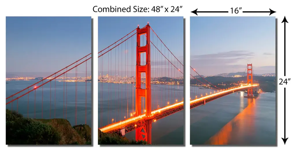 48"œ x 24"œ total size. Ready To Hang! (3 pieces - 16"œ x 24"œ each). 3 Panel Split (Triptych) Metal Print of San Francisco Golden Gate Bridge. Modern metal wall art for home or office wall decor & interior design. Printed on Luxurious, HD aluminum glossy metal panels. Multi panel art.. HD aluminum panels. Metal print wall art. Includes Shadow Wall Mount on the back.• Aluminum Metal Wall Art• Made in USA• Ready to hang - No assembly required• Shadow mount hardware on the back• 0.045"œ thick HD Aluminum Panels• Scratch resistant, glossy finish• Superb color clarity, luxurious prints• Epson printing process• For indoor or moisture rich environment use• Easy to clean. Gently wipe with microfiber cloth.