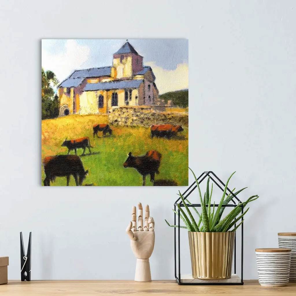 Contemporary painting of several cows grazing in a field near a farmhouse.
