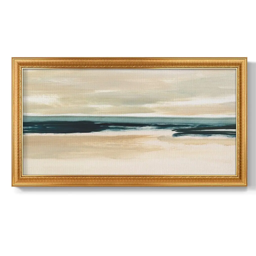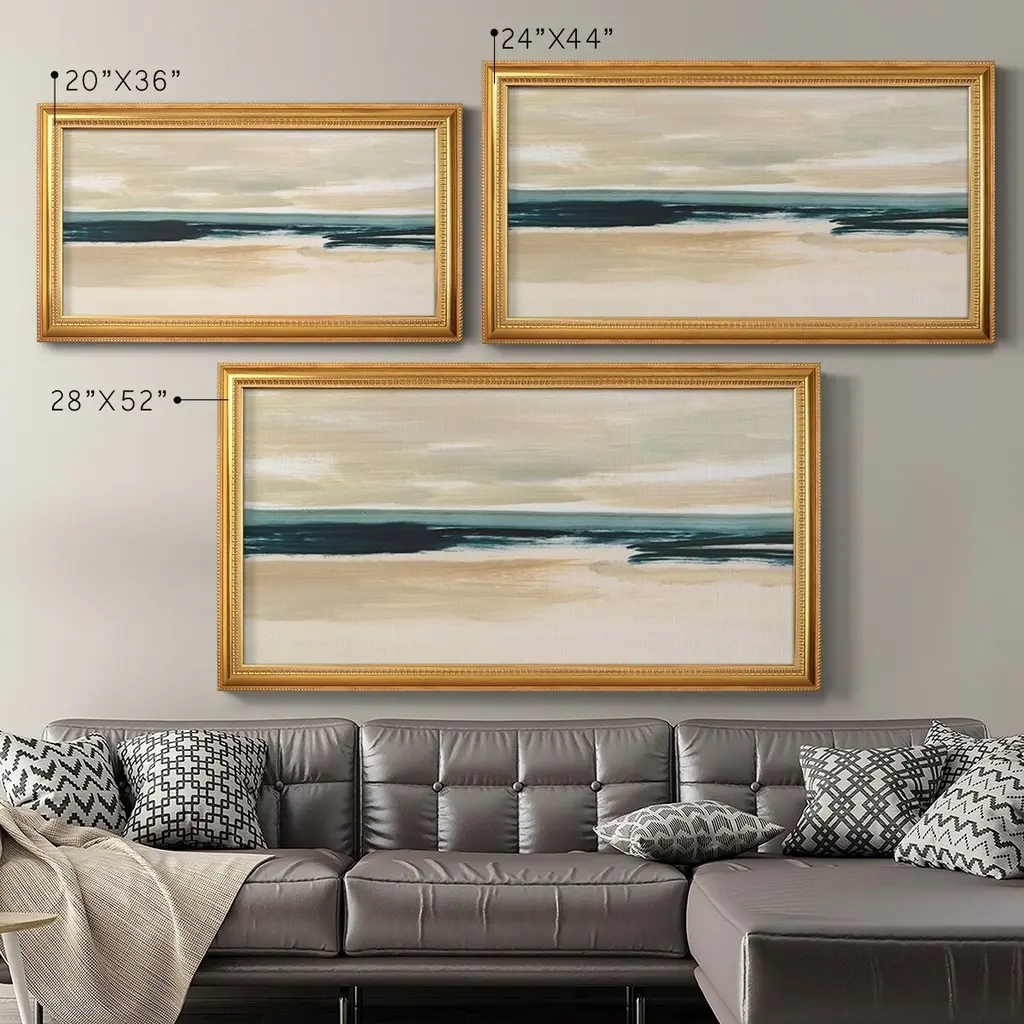 Sand & Sea I Premium Framed Canvas- Ready to Hang A Premium Framed Canvas created to last. Framed in distressed wood and available in an array of sizes and colors Featuring a beveled a solid wood stretcher bar, each piece comes ready to hand 3 SIZES AVAILABLE 21''X37'' - Overall Size 25''X45'' - Overall Size 29''x53'' - Overall Size Each piece is made to order. Each piece comes with hanging hardware. Made in the USA Ready to Hang Giclee Paper Print Acrylic Glass Beveled Matt Board