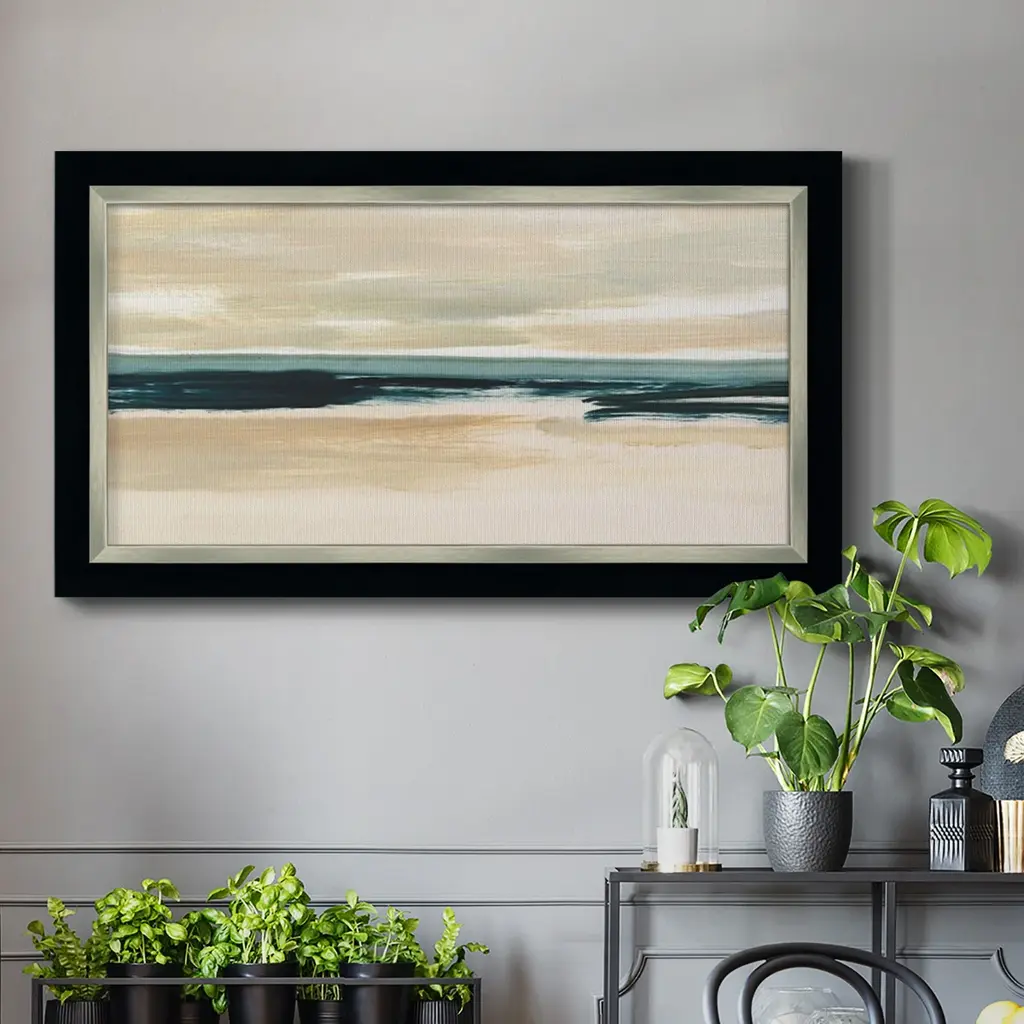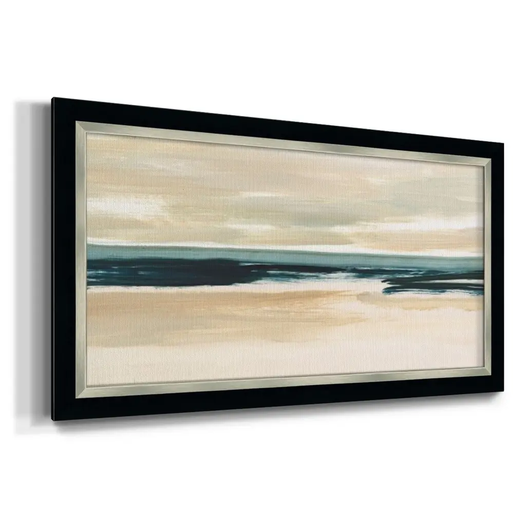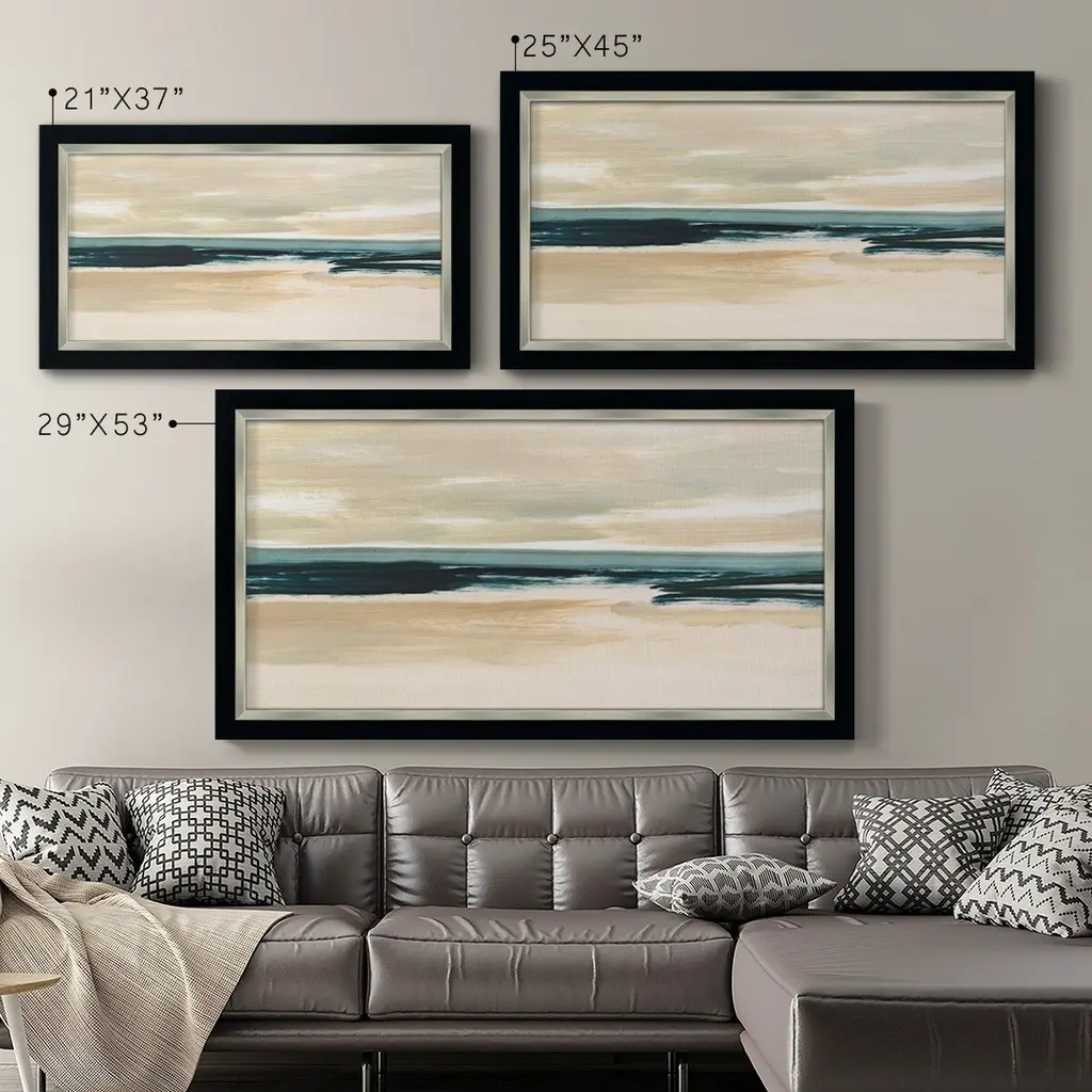 Sand & Sea I Premium Framed Canvas- Ready to Hang A Premium Framed Canvas created to last. Framed in distressed wood and available in an array of sizes and colors Featuring a beveled a solid wood stretcher bar, each piece comes ready to hand 3 SIZES AVAILABLE 21''X37'' - Overall Size 25''X45'' - Overall Size 29''x53'' - Overall Size Each piece is made to order. Each piece comes with hanging hardware. Made in the USA Ready to Hang Giclee Paper Print Acrylic Glass Beveled Matt Board