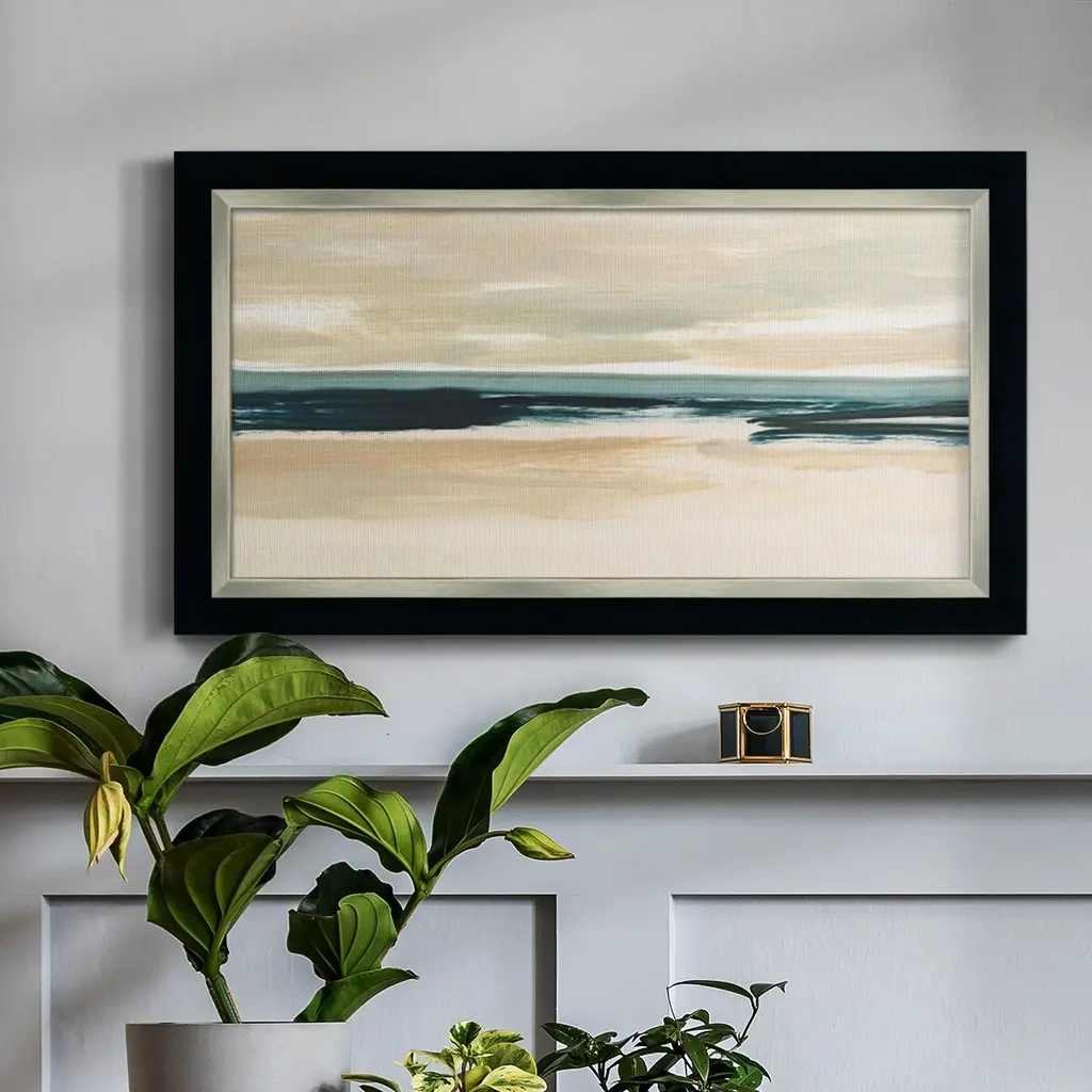 Sand & Sea I Premium Framed Canvas- Ready to Hang A Premium Framed Canvas created to last. Framed in distressed wood and available in an array of sizes and colors Featuring a beveled a solid wood stretcher bar, each piece comes ready to hand 3 SIZES AVAILABLE 21''X37'' - Overall Size 25''X45'' - Overall Size 29''x53'' - Overall Size Each piece is made to order. Each piece comes with hanging hardware. Made in the USA Ready to Hang Giclee Paper Print Acrylic Glass Beveled Matt Board