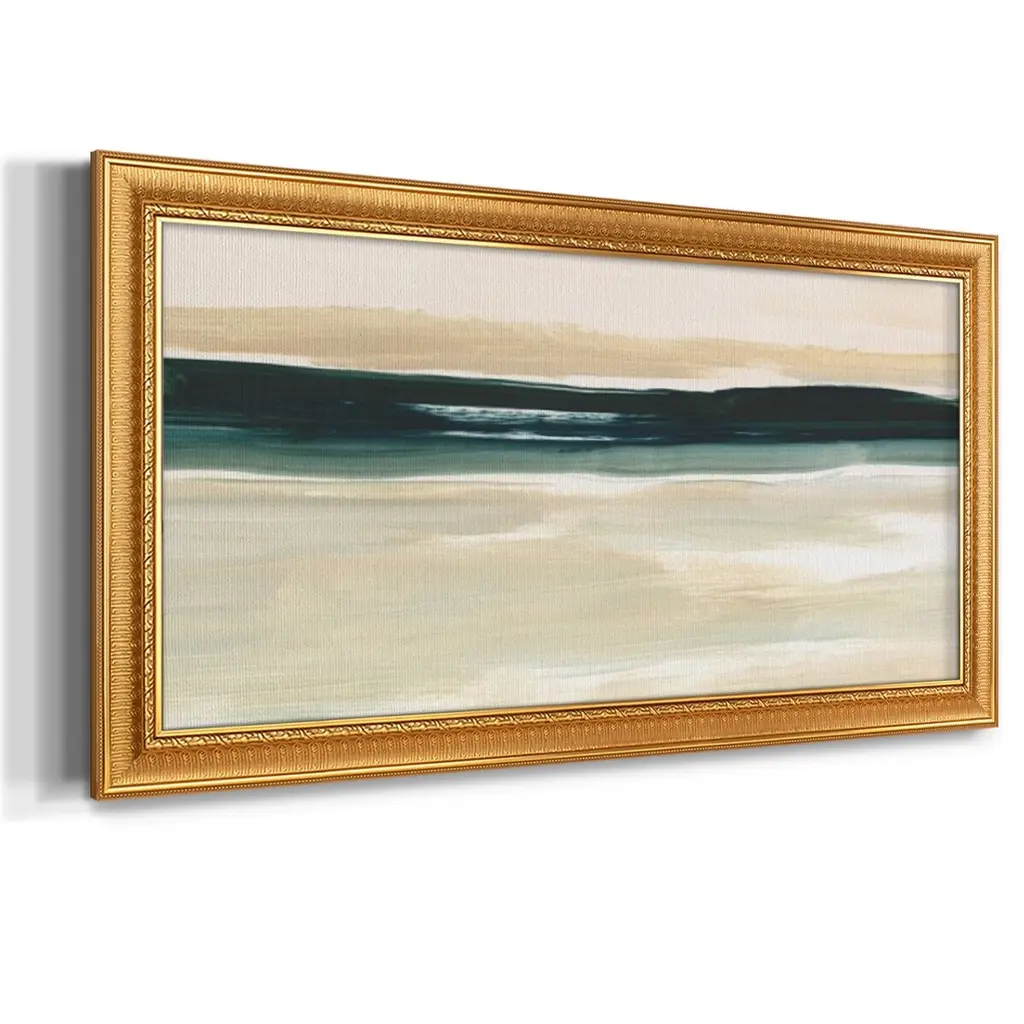 Sand & Sea II Premium Framed Canvas- Ready to Hang A Premium Framed Canvas created to last. Framed in distressed wood and available in an array of sizes and colors Featuring a beveled a solid wood stretcher bar, each piece comes ready to hand 3 SIZES AVAILABLE 21''X37'' - Overall Size 25''X45'' - Overall Size 29''x53'' - Overall Size Each piece is made to order. Each piece comes with hanging hardware. Made in the USA Ready to Hang Giclee Paper Print Acrylic Glass Beveled Matt Board