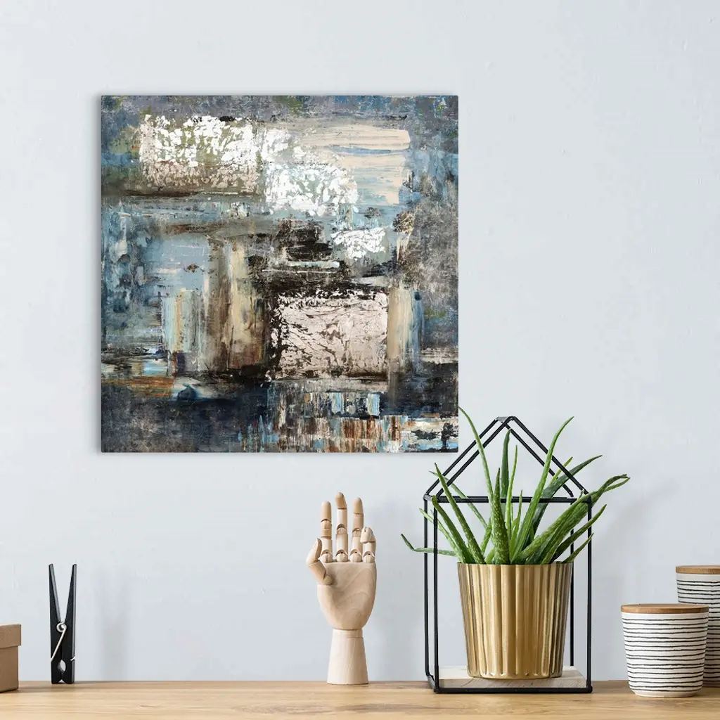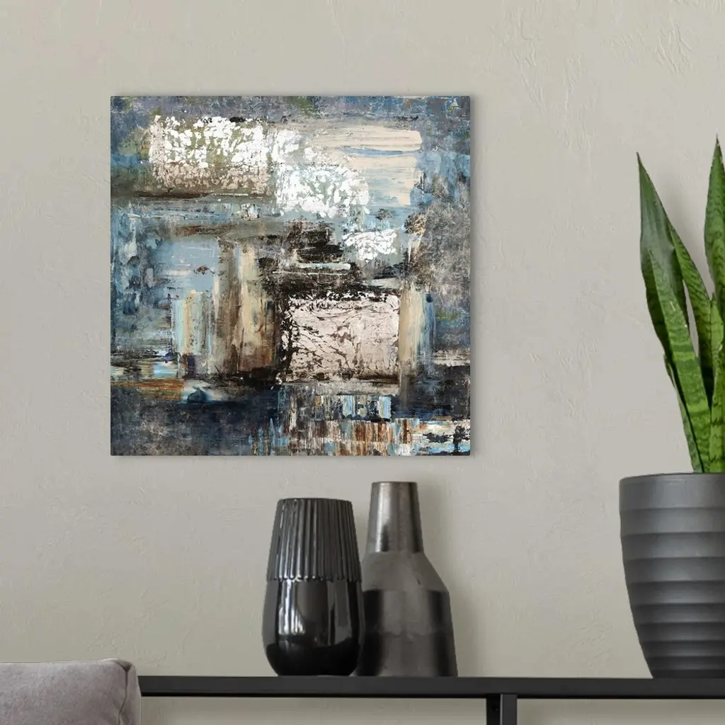 Contemporary abstract painting of blue and neutral earth tones merging together.