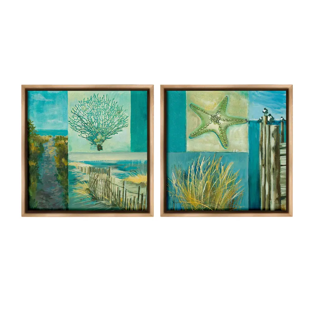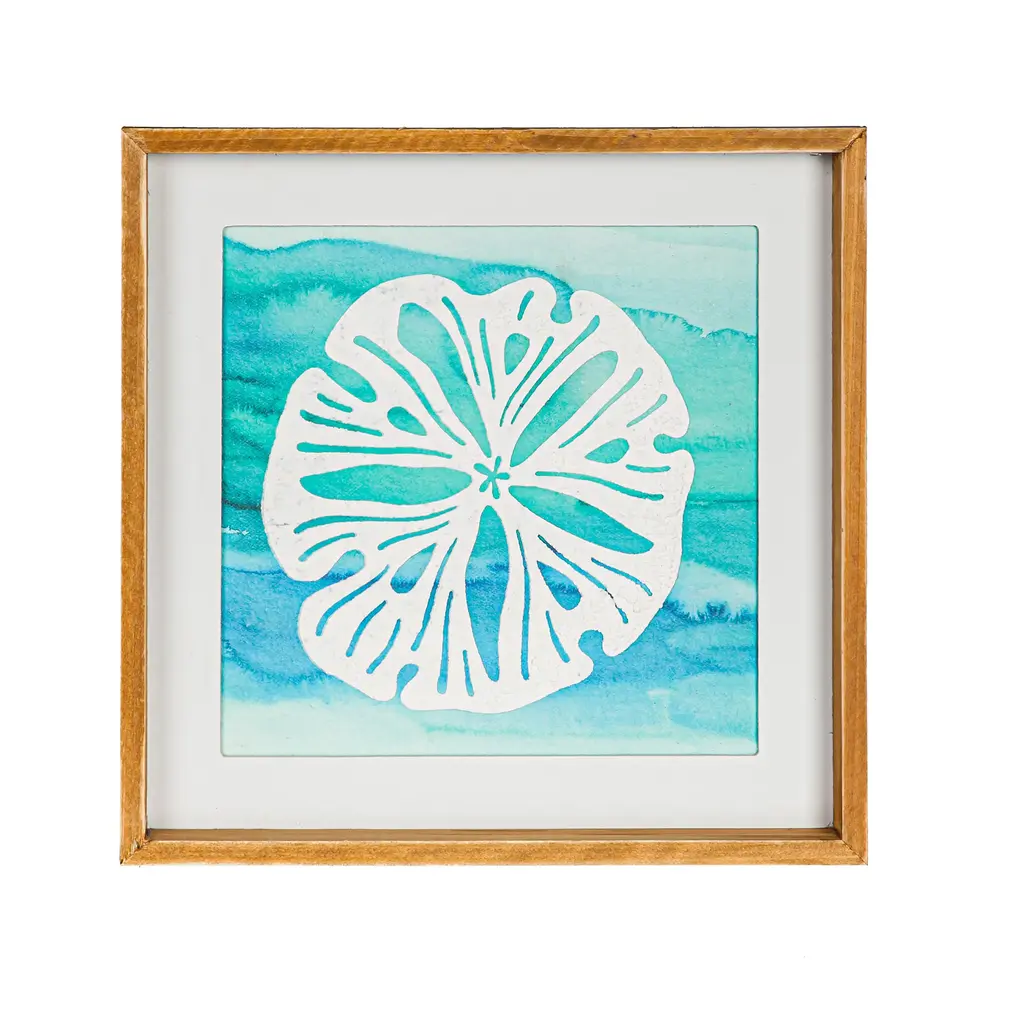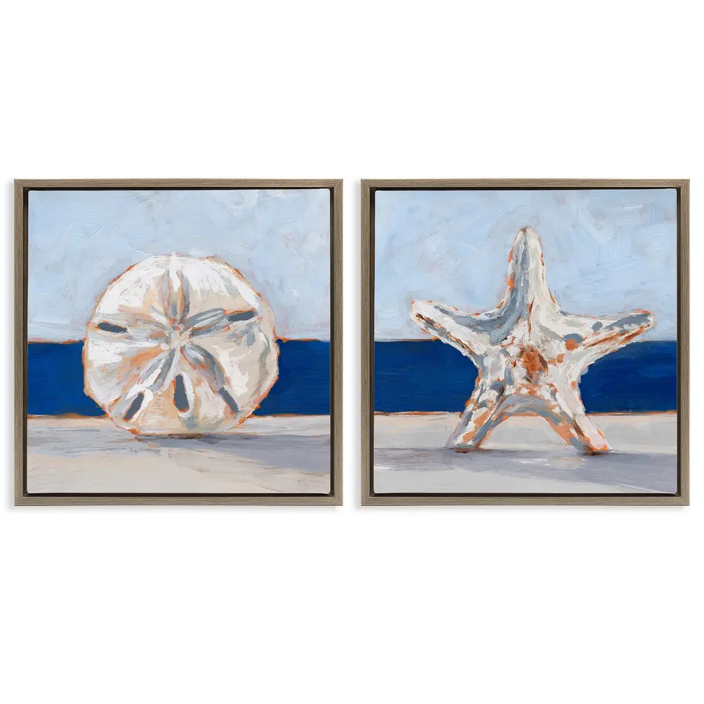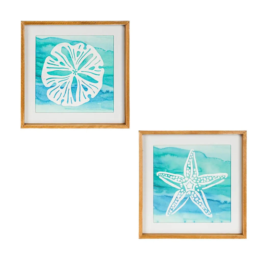 Give your home a tropical touch with this wall art duo featuring a sand dollar and starfish design. This set of 2 coastal designs are set in wooden frames. Makes a beautiful accent in any space; perfect for a vacation house or summer decor, this set of wall art will keep you close to the beach. Made of fade-resistant materials, this decor piece will last season after season. A sawtooth hanger on the back allows for easy hanging.