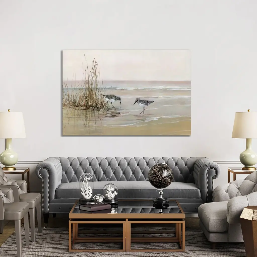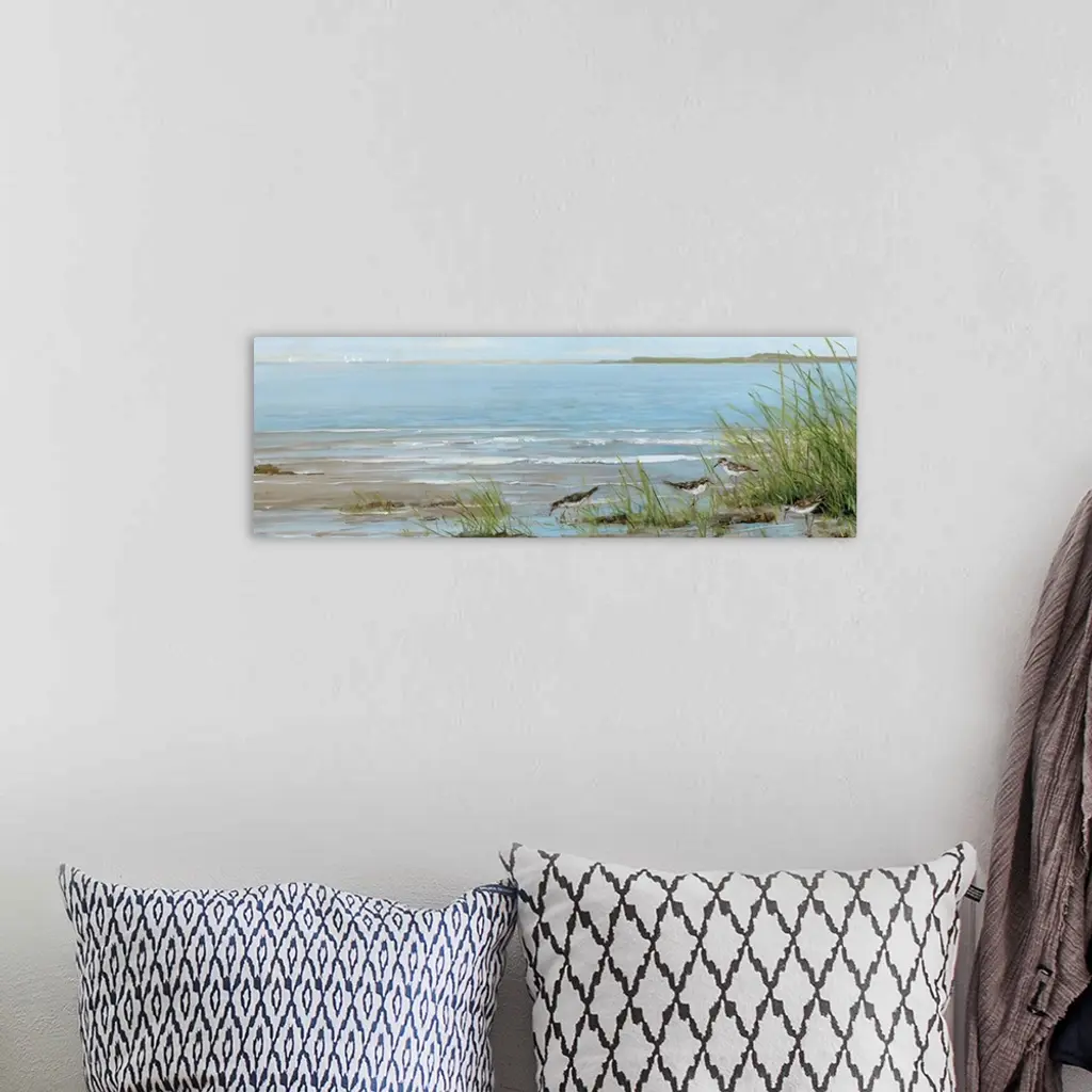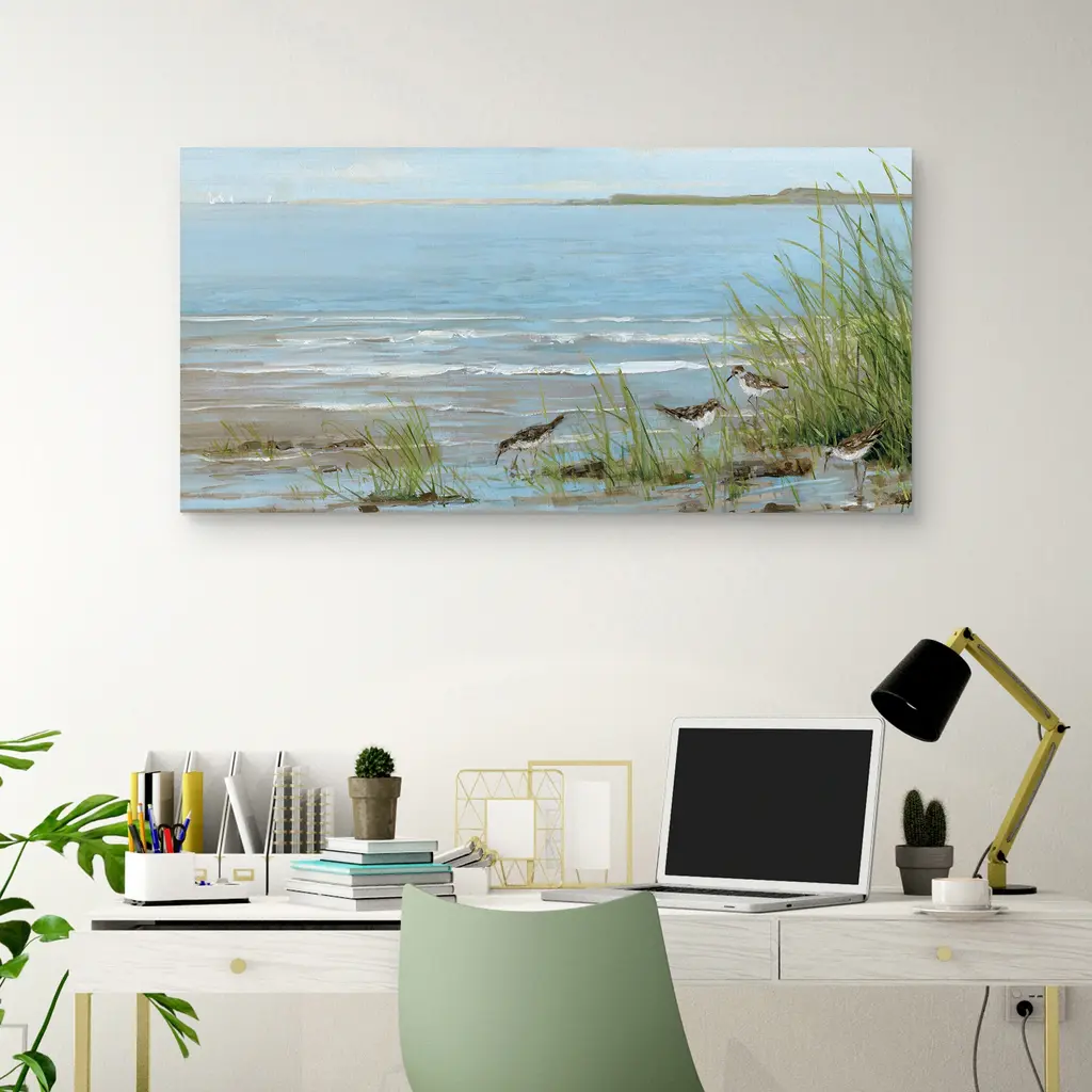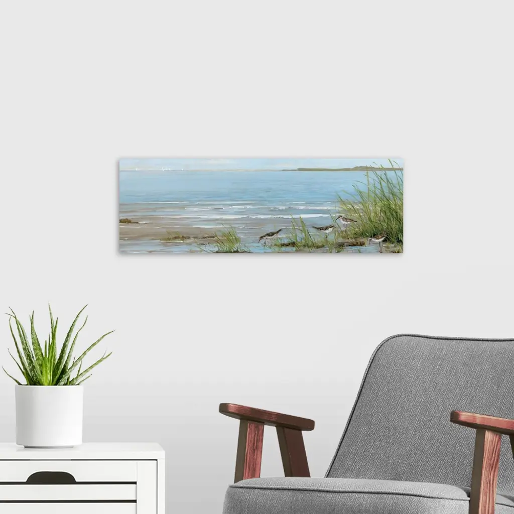 A contemporary painting of a beach scene with birds foraging in the foreground and sailboats in the background.